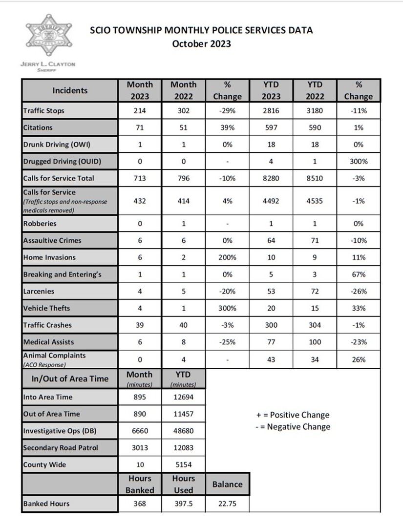 In October 2023, Deputies responded to 713 calls for police service in Scio Twp, down from 796 the previous year for a 10% decrease. Total calls for 2023 (Jan-Oct) are 8,280, down from 8,510 for the same period last year for a 3% decrease.