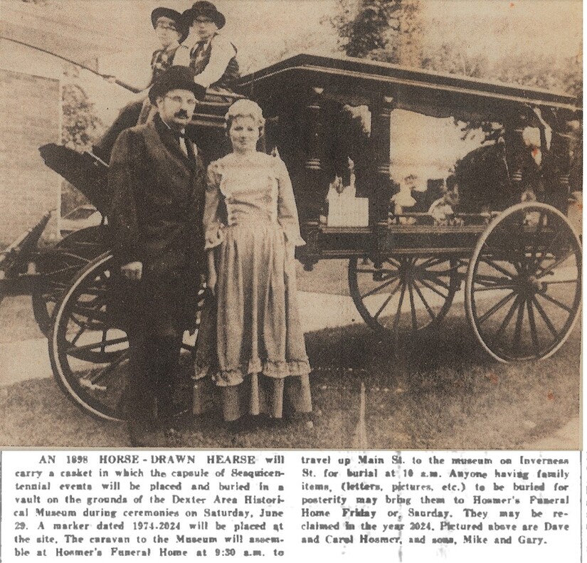Skip back a moment to June 1974, during Dexter's Sesquicentennial celebration. Dexterites marked the occasion by gathering their mementos to bury in a time capsule to be unearthed at the Dexter Bicentennial festivities in June 2024. But there's a twist - the capsule isn't your typical small box. It's a casket sealed inside a concrete burial vault. It seems that would be hard to lose, especially with a headstone marking the spot where they buried it.