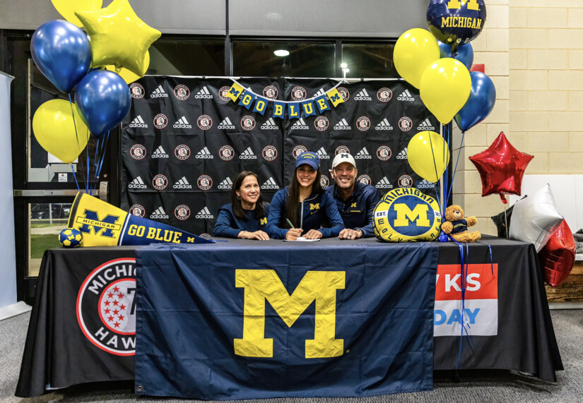 With her parents on signing day. photo by Cooper SchwartzIn her path to getting here, Harshe has played club soccer rather than with the high school team. She said she switched clubs from Dexter Soccer Club to the Michigan Hawks when she was nine years old and has been with the Hawks ever since. She said unfortunately, due to her club commitments, she’s been unable to play soccer for the high school, but she added, “I love to cheer on the team whenever I can!”