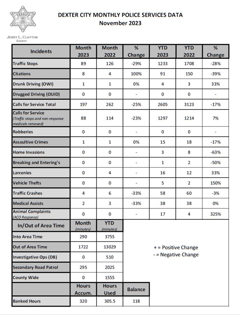 In November 2023, Deputies responded to 197 calls for police service in the City of Dexter, down from 262 the previous year for a 25% decrease. Total calls for the year (Jan-Nov) are 2,605, down from 3,123 for the same period last year, a 17% decrease.