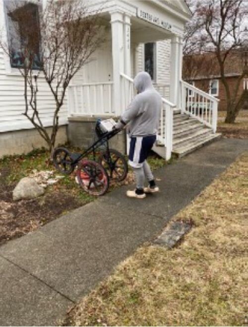 Now for the exciting update! After reading the Sun Times News article on the lost time capsule, Daniel Vencil provided DAHS with family photos showing the vault burial in 1974. On December 22, 2023, Bev met with Larry Stalker, a former employee of the Hosmer Funeral Home, and Andy Soens, a ground penetrating radar technician with Great Lakes GPR in Detroit. It turns out to be buried much deeper than expected – around four feet deep instead of the assumed two – next to the museum’s front steps.