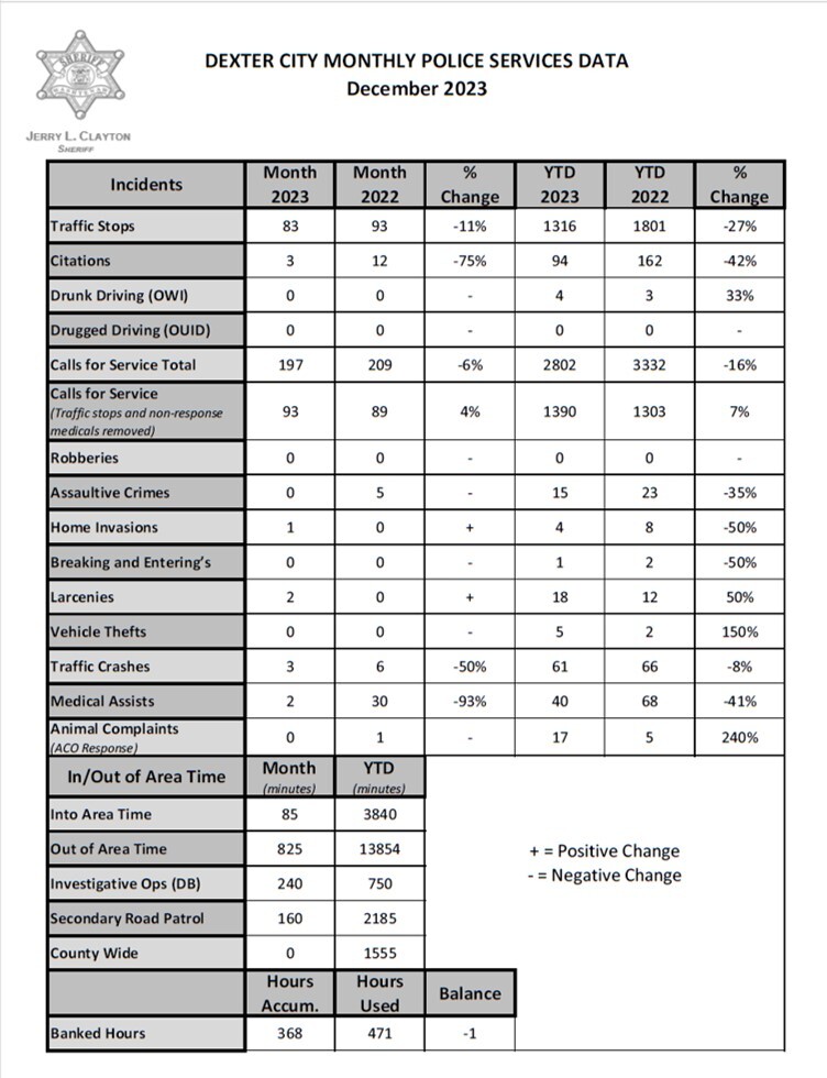 In December, Deputies responded to 197 calls for police service in the City of Dexter, down from 209 the previous year, a 6% decrease. Total calls for 2023 (Jan-Dec) are 2,802, down from 3,332 for the same period last year for a 16% decrease.
