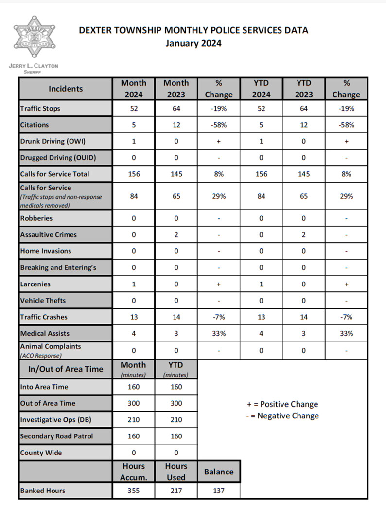 In January, Deputies responded to 156 calls for police service in Dexter Township, up from 145 the previous year for an 8% increase.
