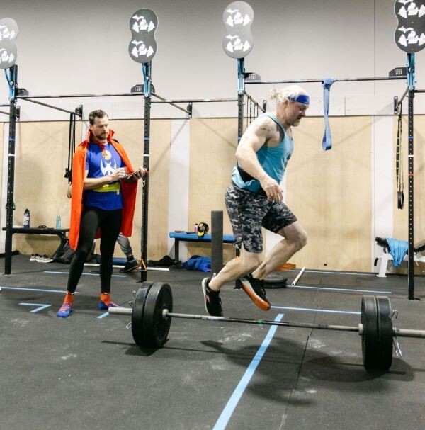 Owner/Coach Colby Buswell scores another Mitten Fitness Coach, Josh Fink, on the quality of his reps for official entry into the 2022 CrossFit Open. Most members do not officially enter the Open and don’t take themselves too seriously, as Buswell’s costume suggests. Photo by Cat Carty-Buswell.“I’d say not being affiliated and not putting any pressure out there to register officially helps break through any apprehension of trying the Open workouts,” observes Buswell.