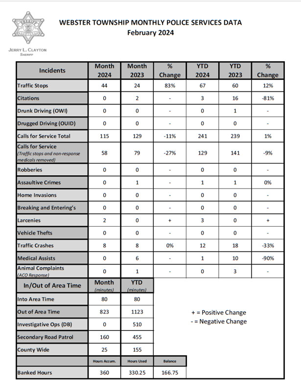 In February, Deputies responded to 115 calls for police service in Webster Township, down from 129 the previous year for an 11% decrease. Total calls for 2024 (Jan-Feb) are 241, up slightly from 239 for the same period last year, a 1% change.