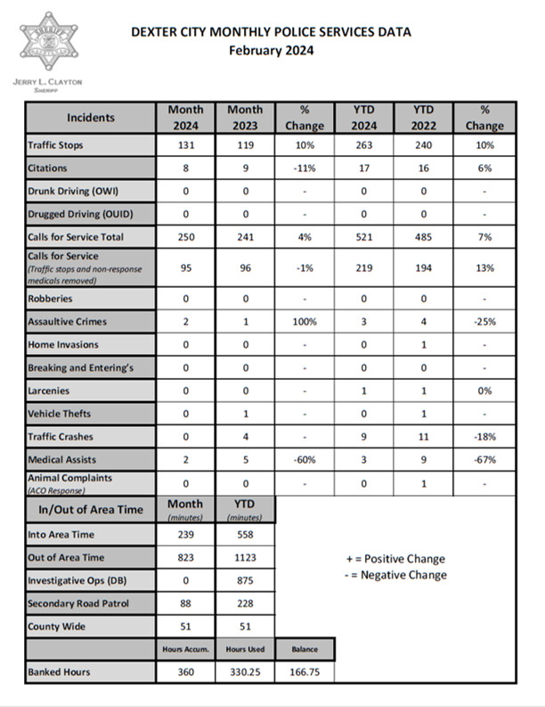 In February, Deputies responded to 250 calls for police service in the City of Dexter, up from 241 the previous year for a 4% increase. Total calls for 2024 (Jan-Feb) are 521, up from 485 for the same period last year, a 7% increase.