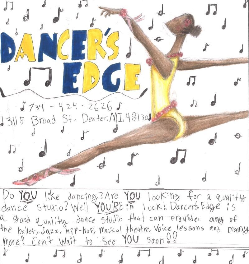 Dancers Edge by Mea“All the students involved in this project are 6th-grade students who are a part of the Summit Learning Community at Creekside Intermediate School,” explains Robke. “Summit Learning is a hands-on, project-based approach to learning with real-world applications, such as this project. We were excited to work on this project with the Sun Times, along with local businesses, as it allowed students to take on the role of a copywriter, graphic designer, and marketing manager.”