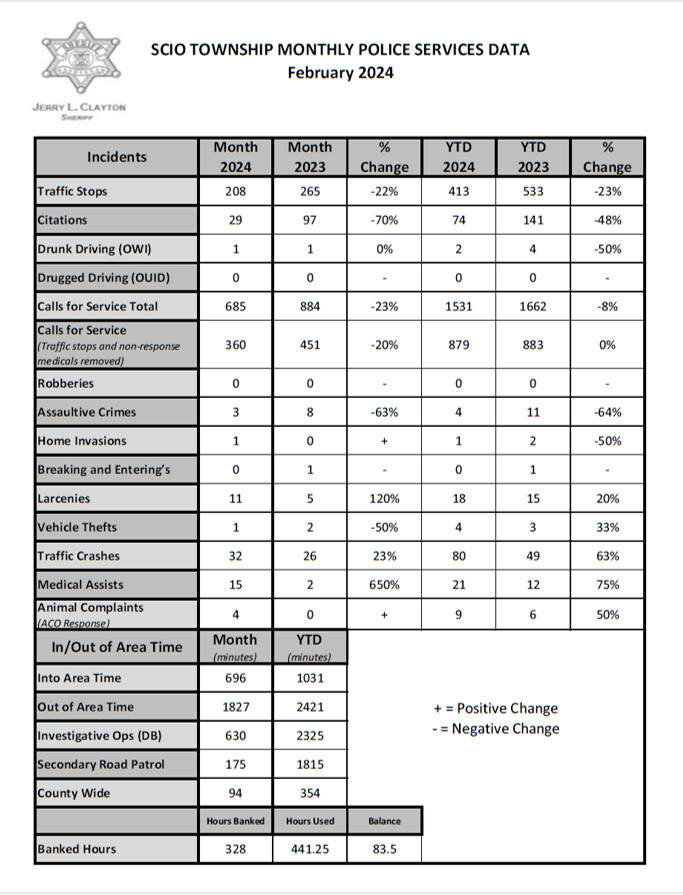 In February, Deputies responded to 685 calls for police service in Scio Township, down from 884 the previous year, a 23% decrease. Calls for 2024 (Jan-Feb) are 1,531, down from 1,662 for last year, an 8% decrease.
