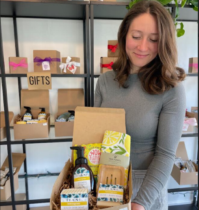 Violet with a Tiani Body Care personalized gift box. Photo by Mel MarcumThis entrepreneur is a wife and mother of 2 children under the age of 4. She is not the only business owner in her family. With an engineering background, her husband is the owner of The Raterman Bread Haus & Bistro in downtown Dexter. Nick’s storefront has an expanded menu; producing high-quality, German-style sourdough breads and other baked goods, artisan pizzas, fresh sandwiches, seasonal soups, salads, and an array of healthy, fresh options.