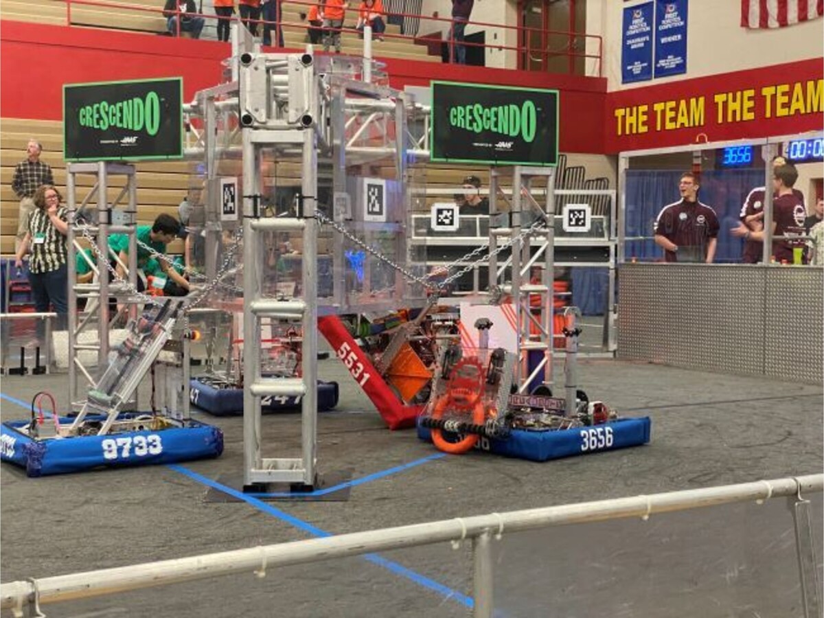 Woofer climbs the stage chain using its MKII climber hooks. (Photo by Cory Schimelfening)The Dreadbots encourage you to join them. “It really helped me learn a lot of new skills I wouldn't have learned anywhere else,” says Izzy Martinez, a 1st year member on the mechanical subteam. You can contact us at [email protected].