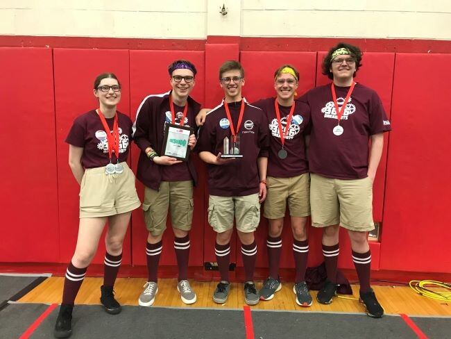 The Drive team shows off our Innovation in Controls award. (Photo by Cory Schimelfening)The Dreadbots also won the “Innovation in Controls” award, recognizing the programming sub team's success in incorporating advanced PID control algorithms, which allow the robot to drive straight with precision, and haptic feedback, which allows the drivers to feel when a note has been picked up via controller vibration.