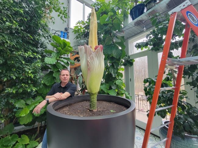 Kevin Hauser with “Corpsy.” Photo by Doug Marrin.What makes Hauser's plant exceptionally noteworthy is the rarity and significance of this event. "There have been eight non-institutional growers to flower this plant in the U.S.," he explains. "It is believed this will be the first flowering globally to occur inside a residential home, and only the second flowering in the U.S. this year."