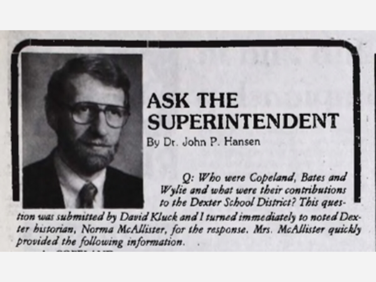 Q: Who were Copeland, Bates and Wylie and what were their contributions to the Dexter School District? This question was submitted by David Kluck, and I turned immediately to noted Dexter historian, Norma McAllister, for the response. Mrs. McAllister quickly provided the following information.