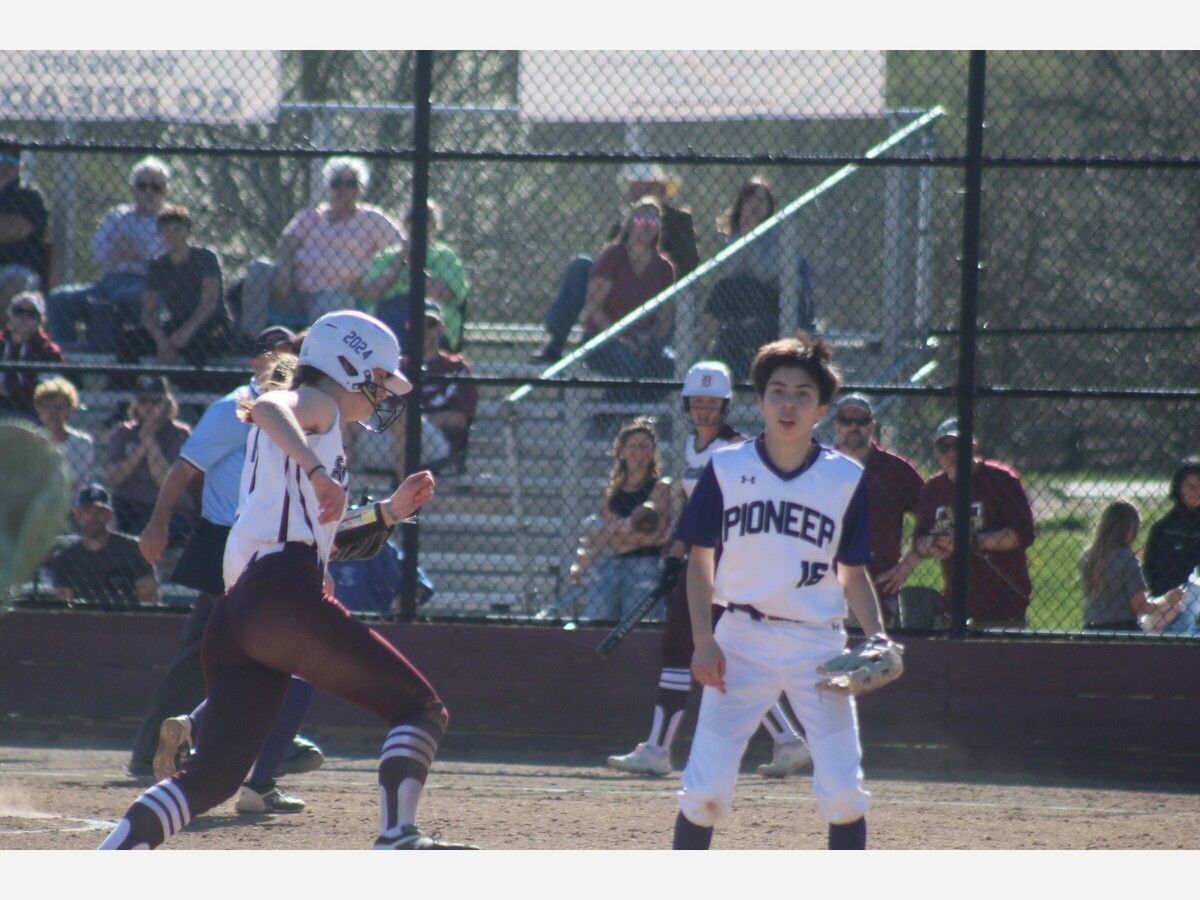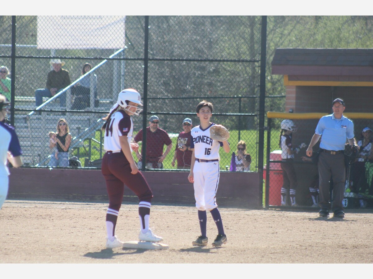 Gauthier struck out 11 of the first 12 batter she faced before Pioneer got a single to lead off the fifth. A sacrifice moved the runner to second and with two outs, a bouncer to shortstop Kyra Sunstrum was bobbled and the Pioneer runner tried to score from second. Sunstrum fired to Maddie Ohlman at home to get the runner and end the inning.