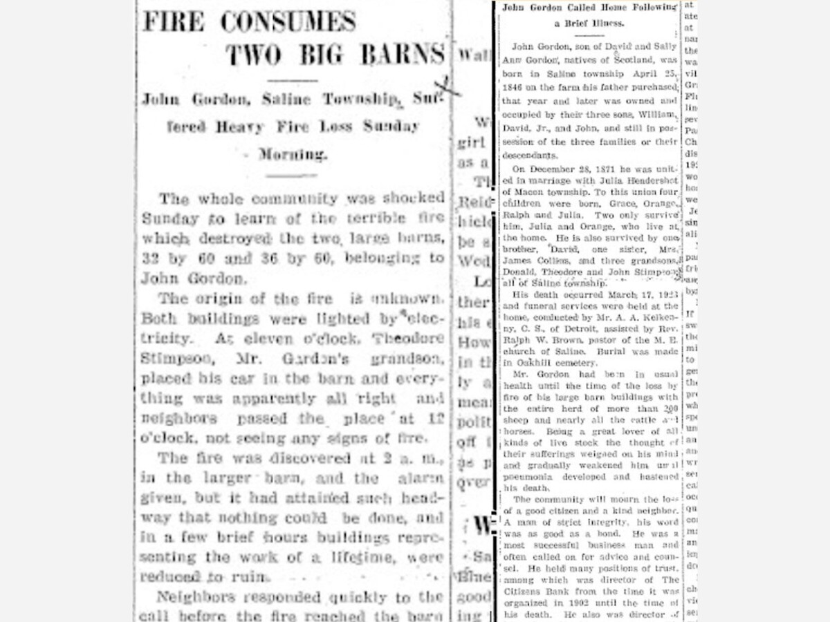 John Gordon dedicated his life to the family farm, and continued to raise animals, as well as work in town. Gordon was the Director of Trust at Citizens Bank in Saline, and a director for his local school district. On December 28, 1871, John married Julia Hendershet, and the two had four children together. On February 1, 1923, The Saline Observer had a front-page story titled “Fire Consumes Two Big Barns.” Around 11:00 p.m. on a Sunday, Gordon’s grandson Theodore Stimpson had parked his truck in one of the barns. At 2:00 a.m. a fire was discovered on the property and had quickly picked up momentum. By the time Gordon, Stimpson and neighbors were able to reach the fire, it had been too late to gain control. Sadly, most of what was in the barns was already compromised, including horses, cows and close to two hundred sheep. Also taken by the fire was 100 tons of hay, 1500 bushels of grain, tools, and supplies. According to the Observer, many people at the scene tried to assist Gordon with pails of water. Some even stood on roofs and were able to save one of the tool barns. The source of the fire was unknown. “In a few brief hours, buildings representing the work of a lifetime were reduced to ruin,” read the Saline Observer.