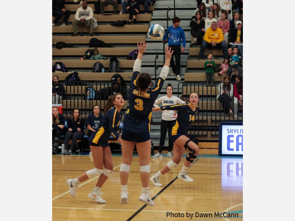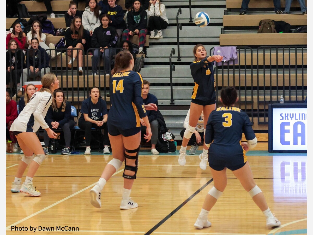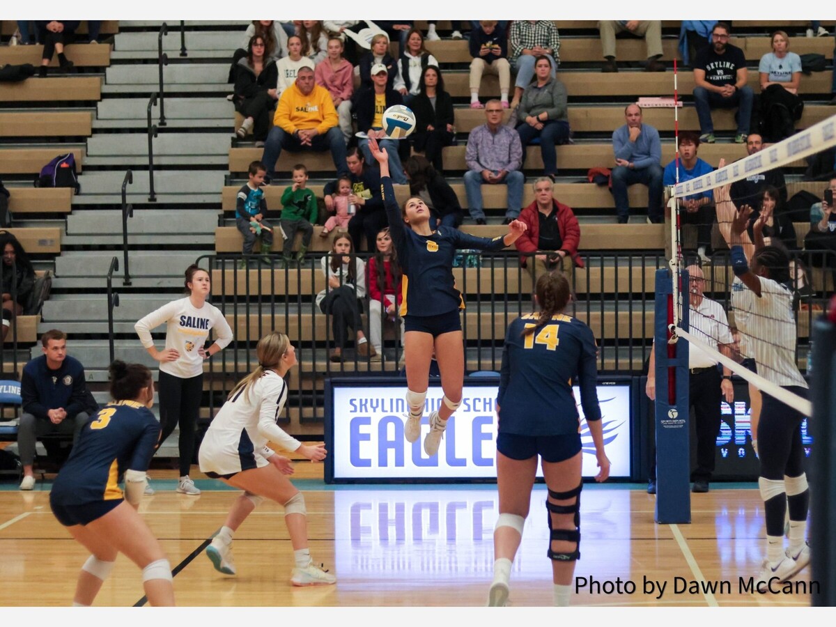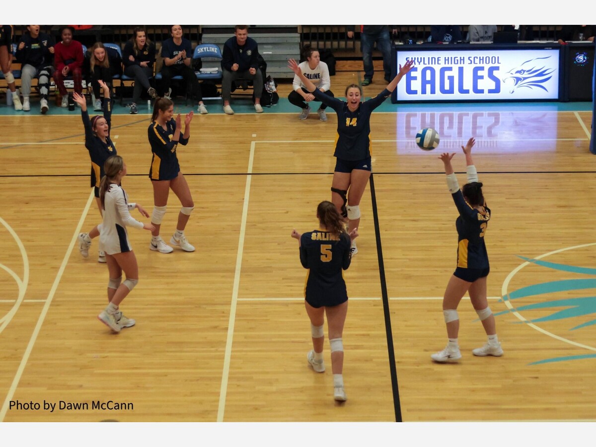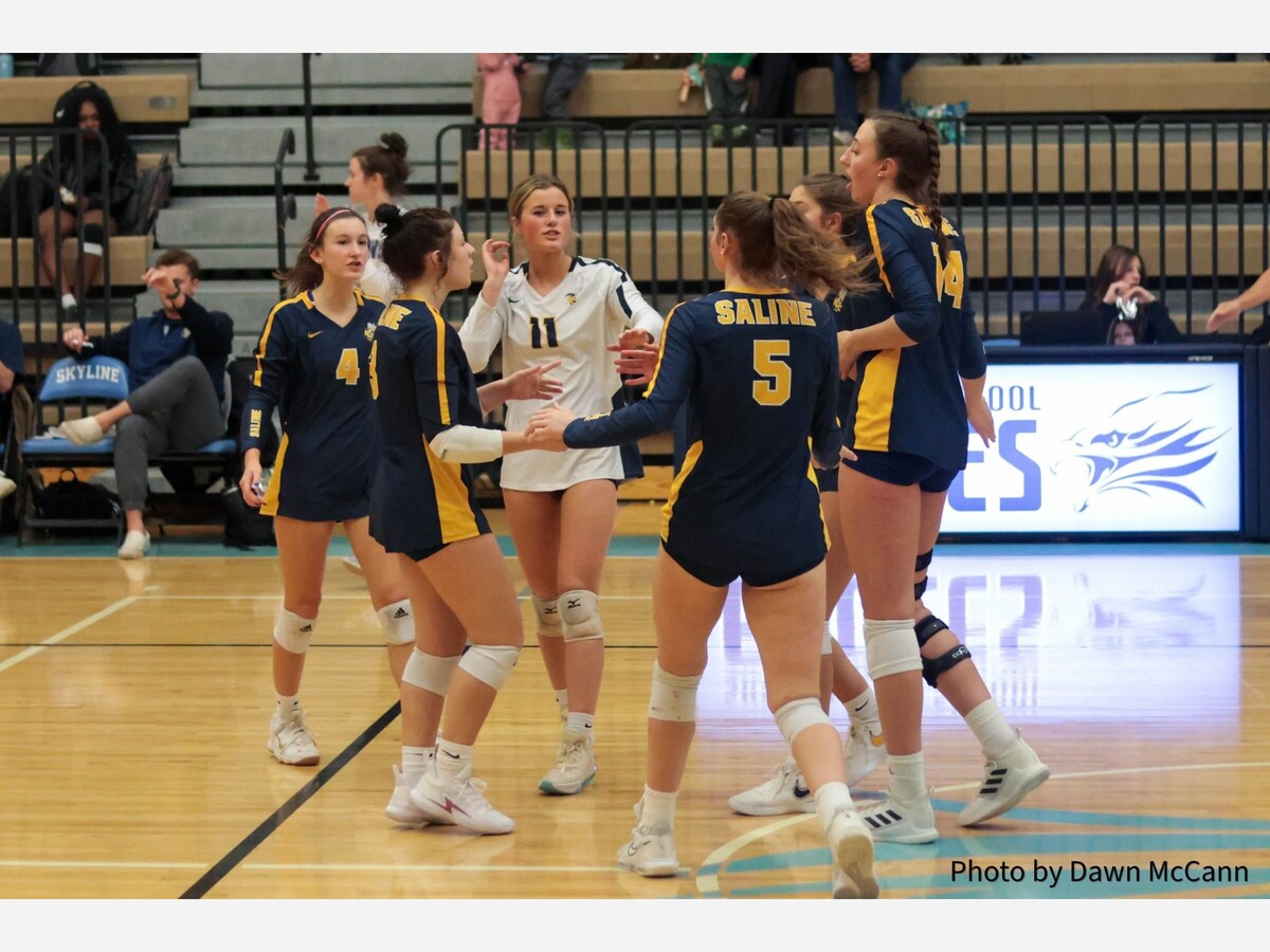 Saline took a 2-0 lead with a 25-16 win in the second set and the third set saw the teams tied at 23, but Skyline was called for an illegal formation for a 24-23 lead and Allie Smith ended the match with an ace.