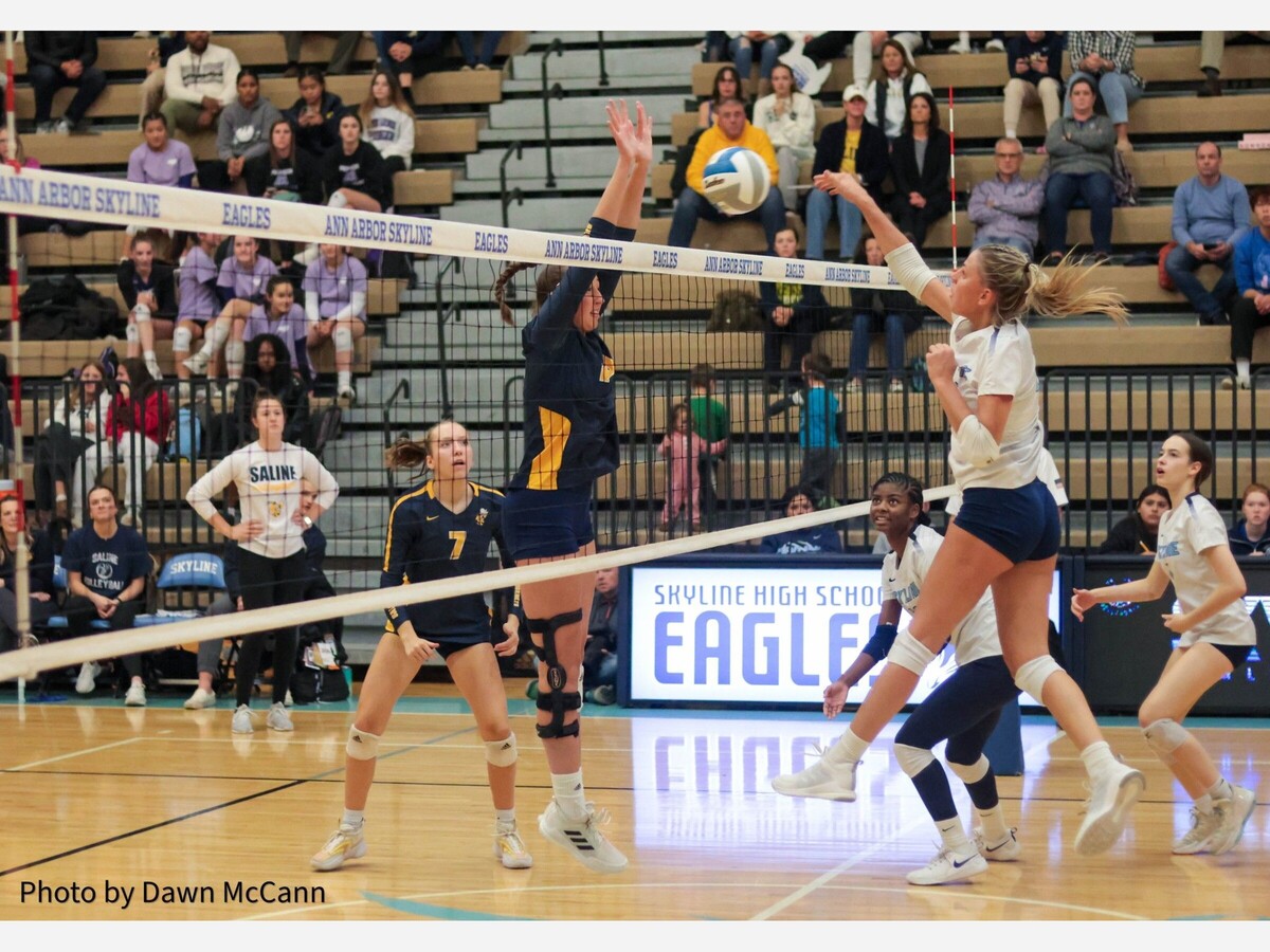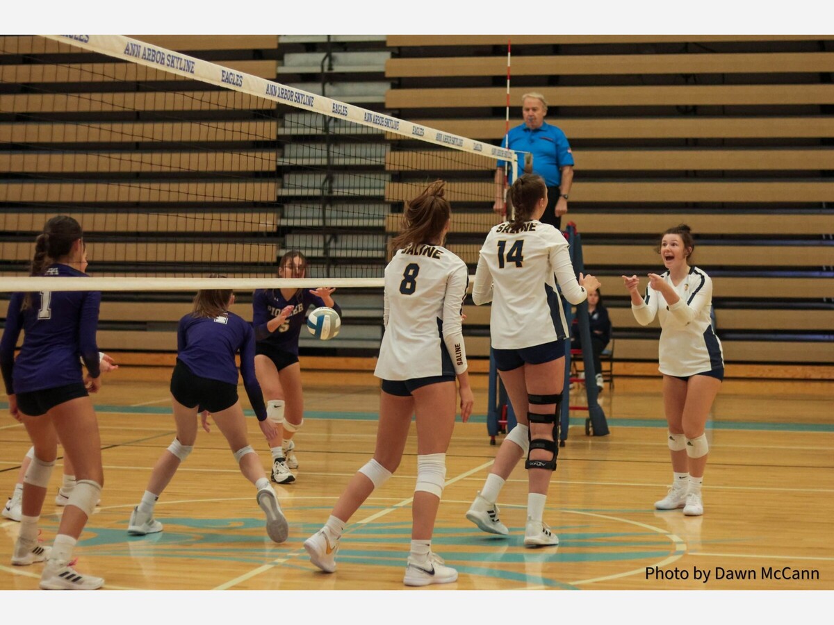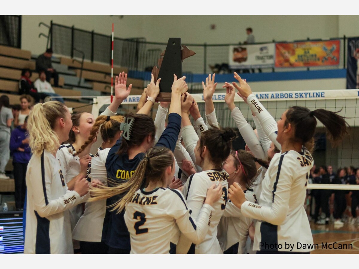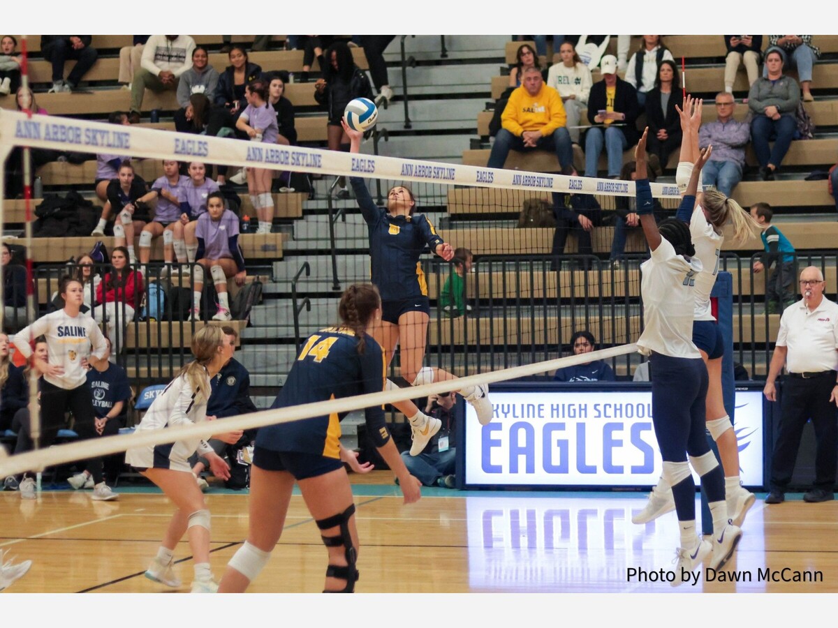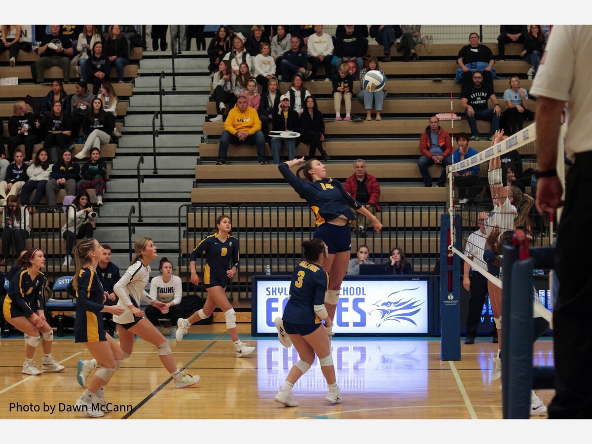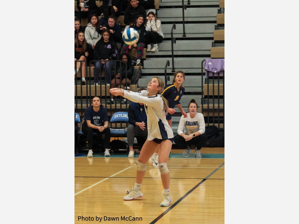 Saline took a 2-0 lead with a 25-16 win in the second set and the third set saw the teams tied at 23, but Skyline was called for an illegal formation for a 24-23 lead and Allie Smith ended the match with an ace.