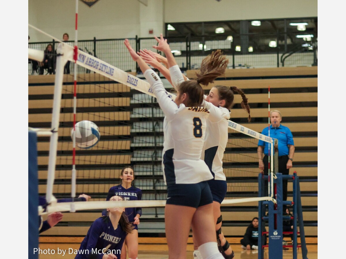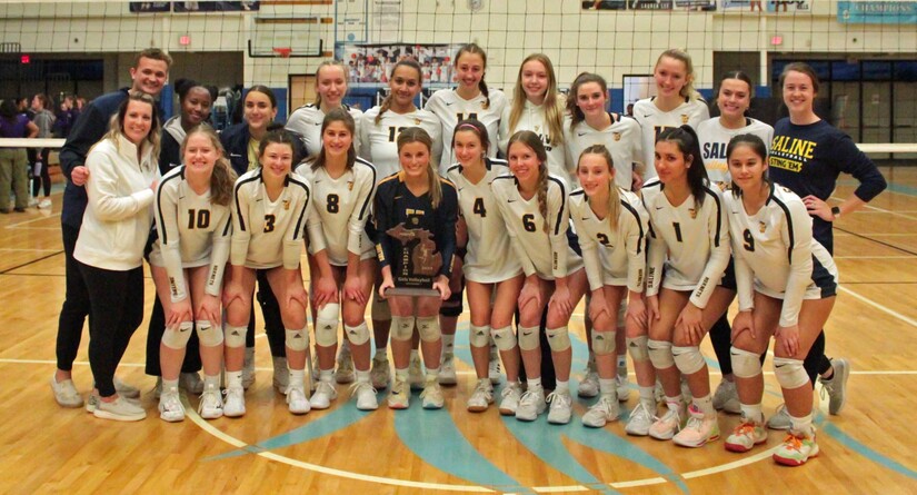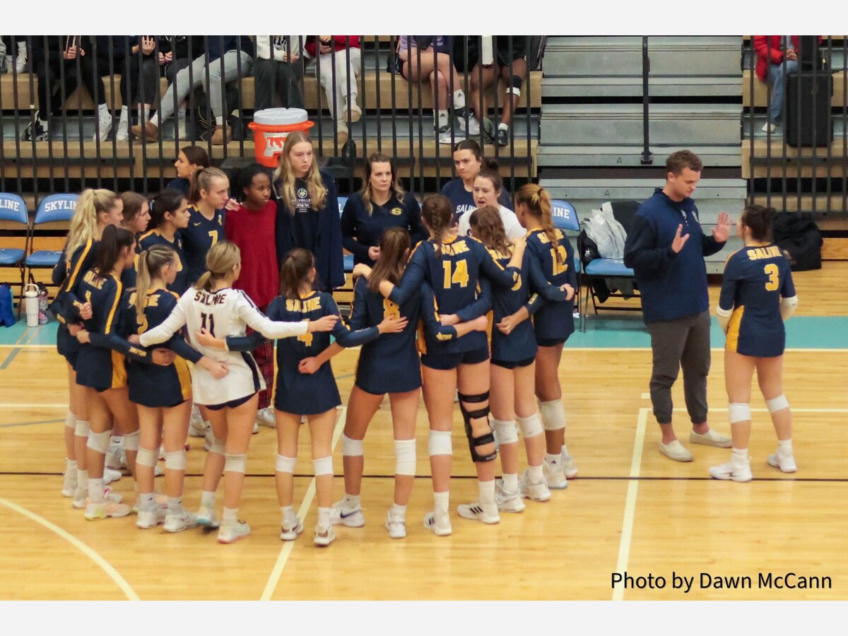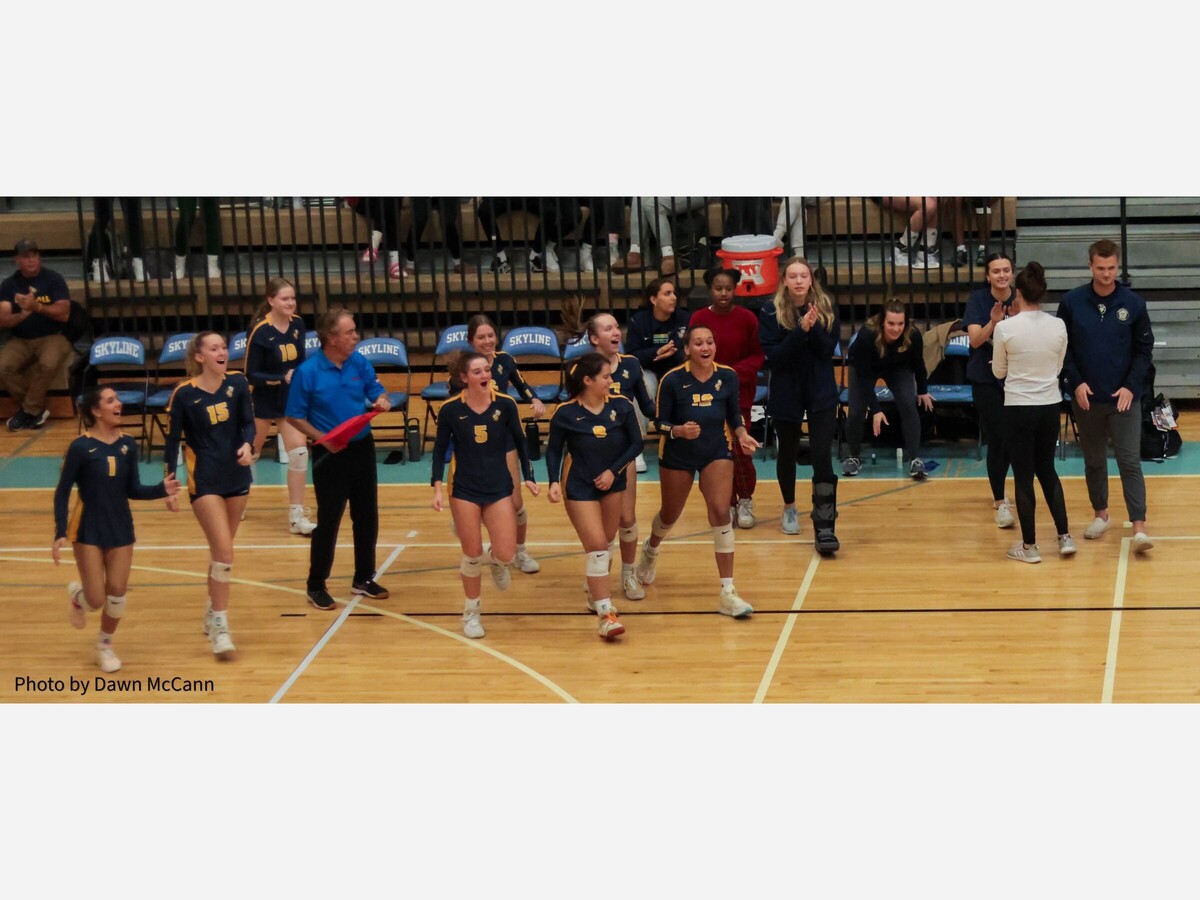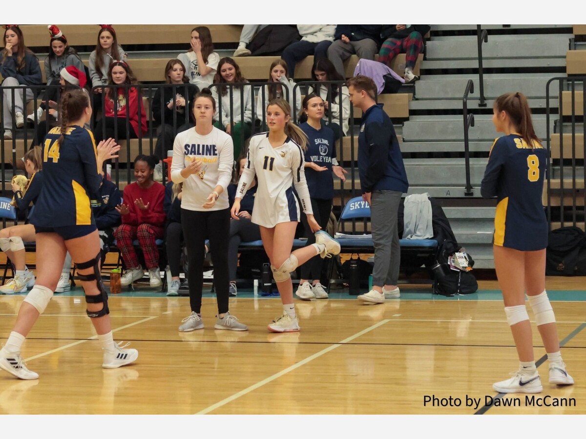 Saline took a 2-0 lead with a 25-16 win in the second set and the third set saw the teams tied at 23, but Skyline was called for an illegal formation for a 24-23 lead and Allie Smith ended the match with an ace.
