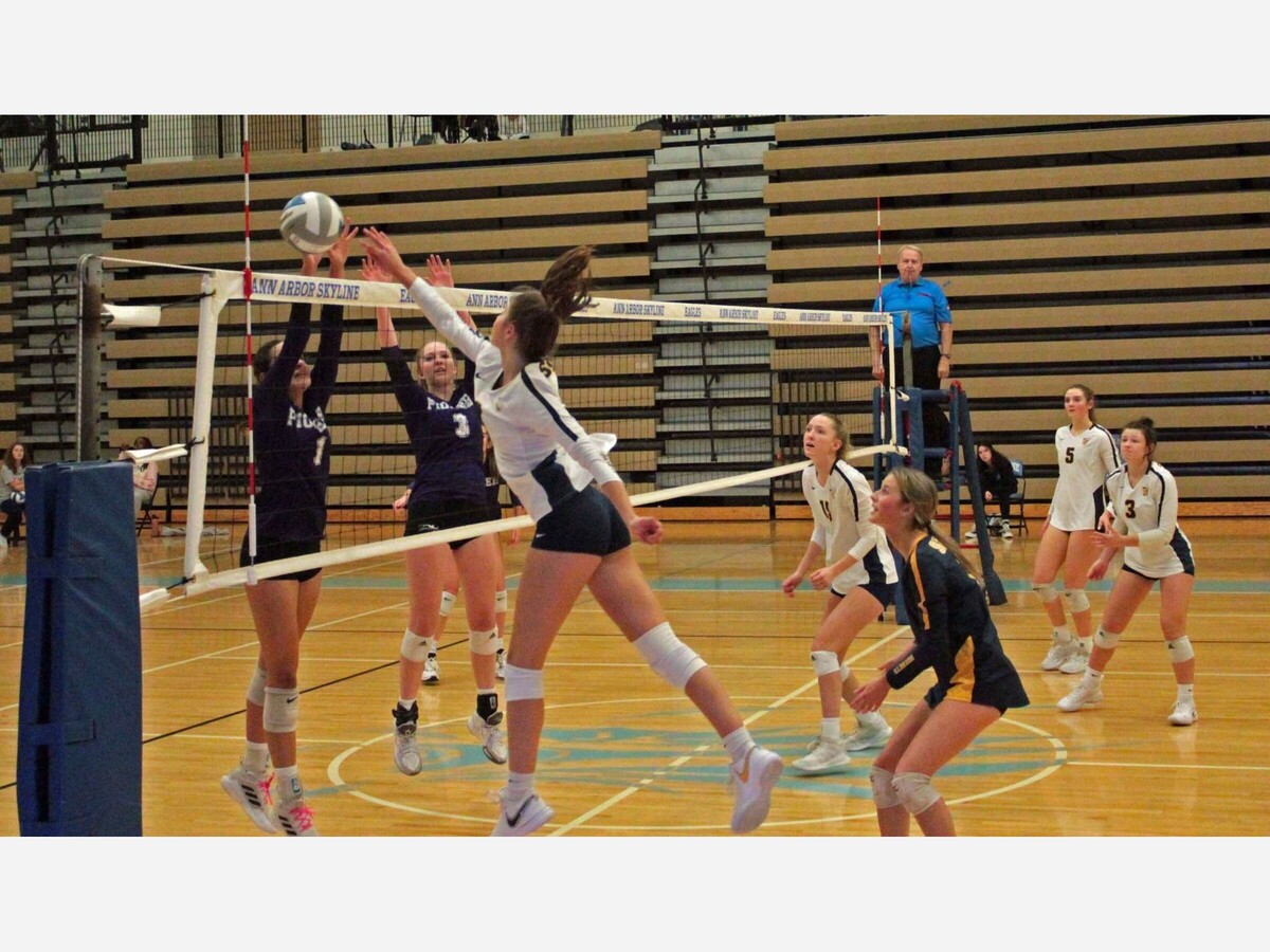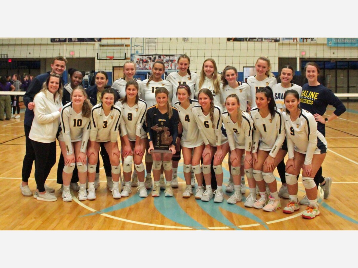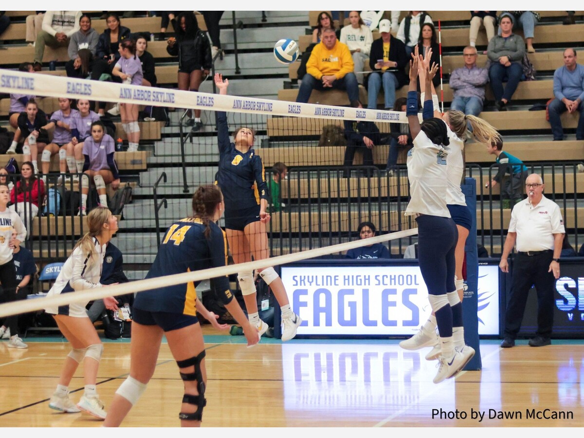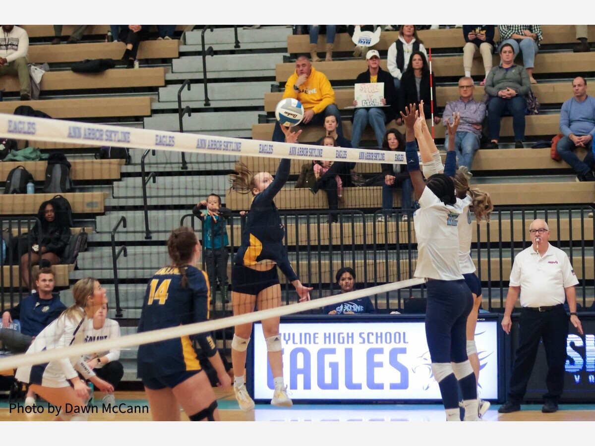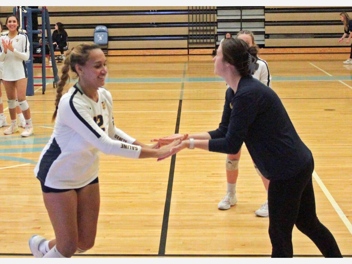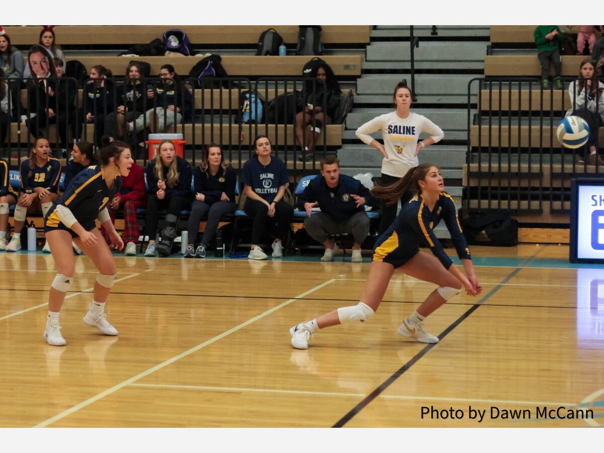 Saline took a 2-0 lead with a 25-16 win in the second set and the third set saw the teams tied at 23, but Skyline was called for an illegal formation for a 24-23 lead and Allie Smith ended the match with an ace.