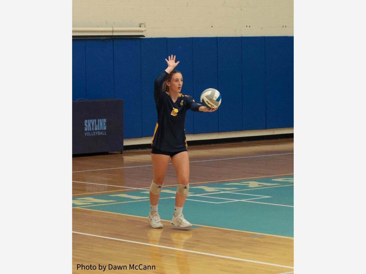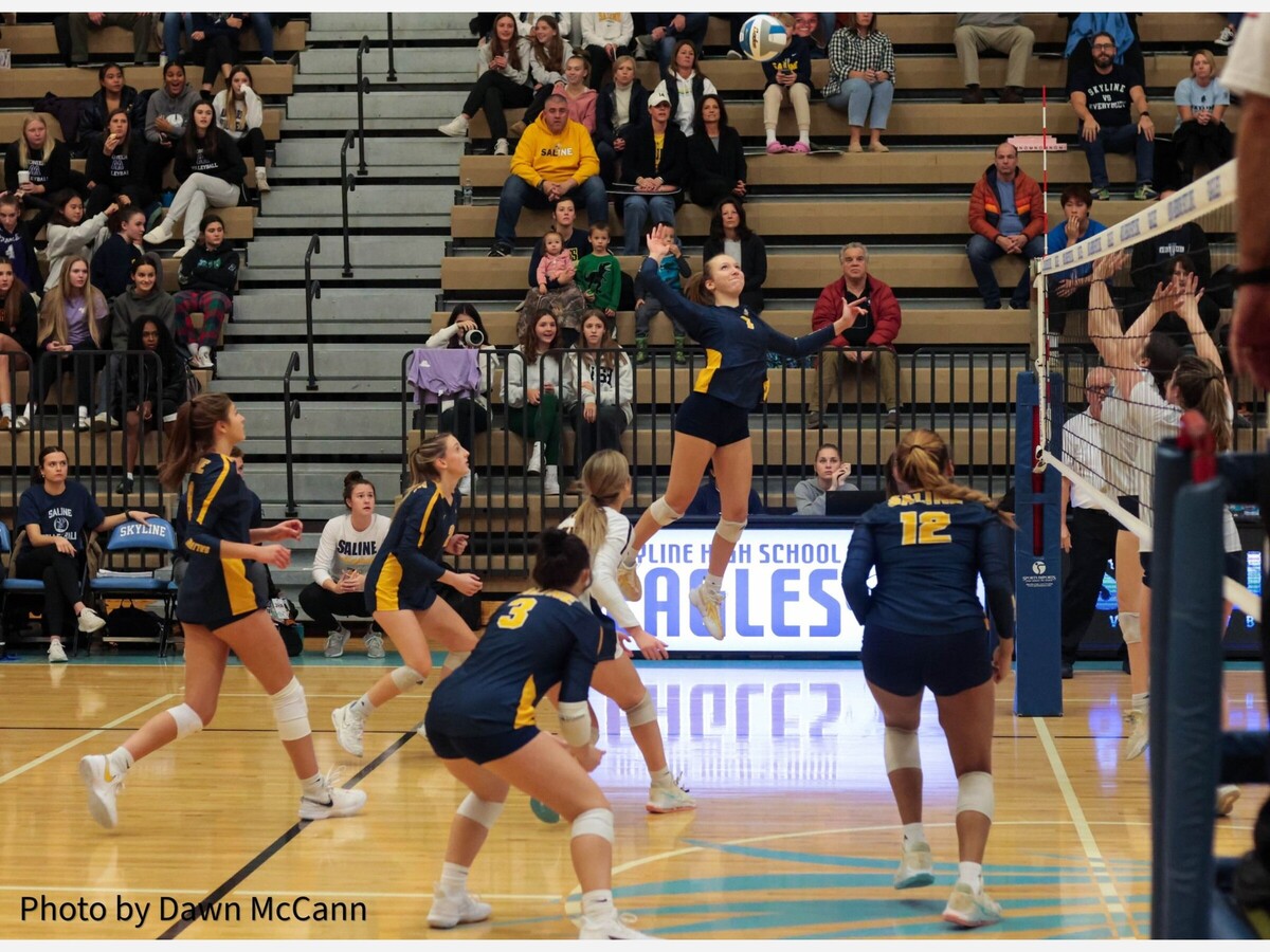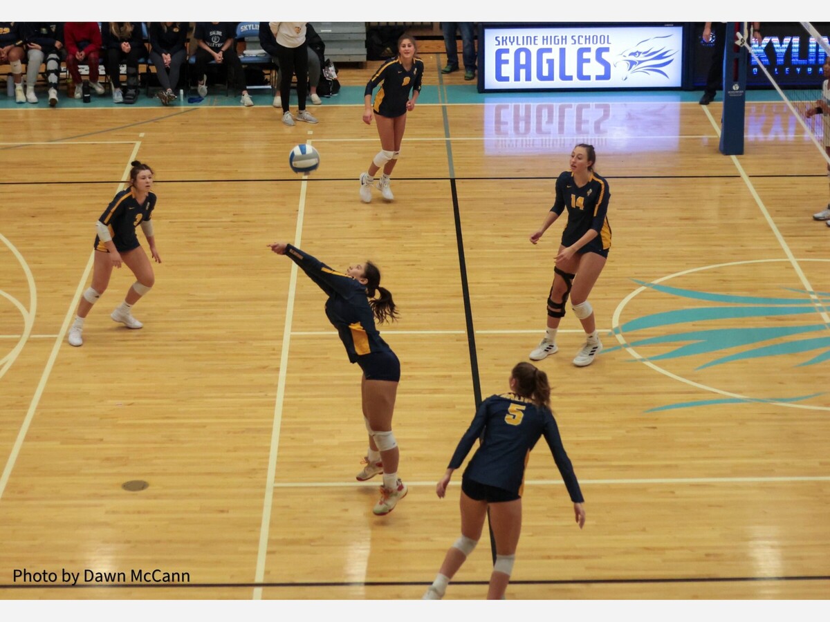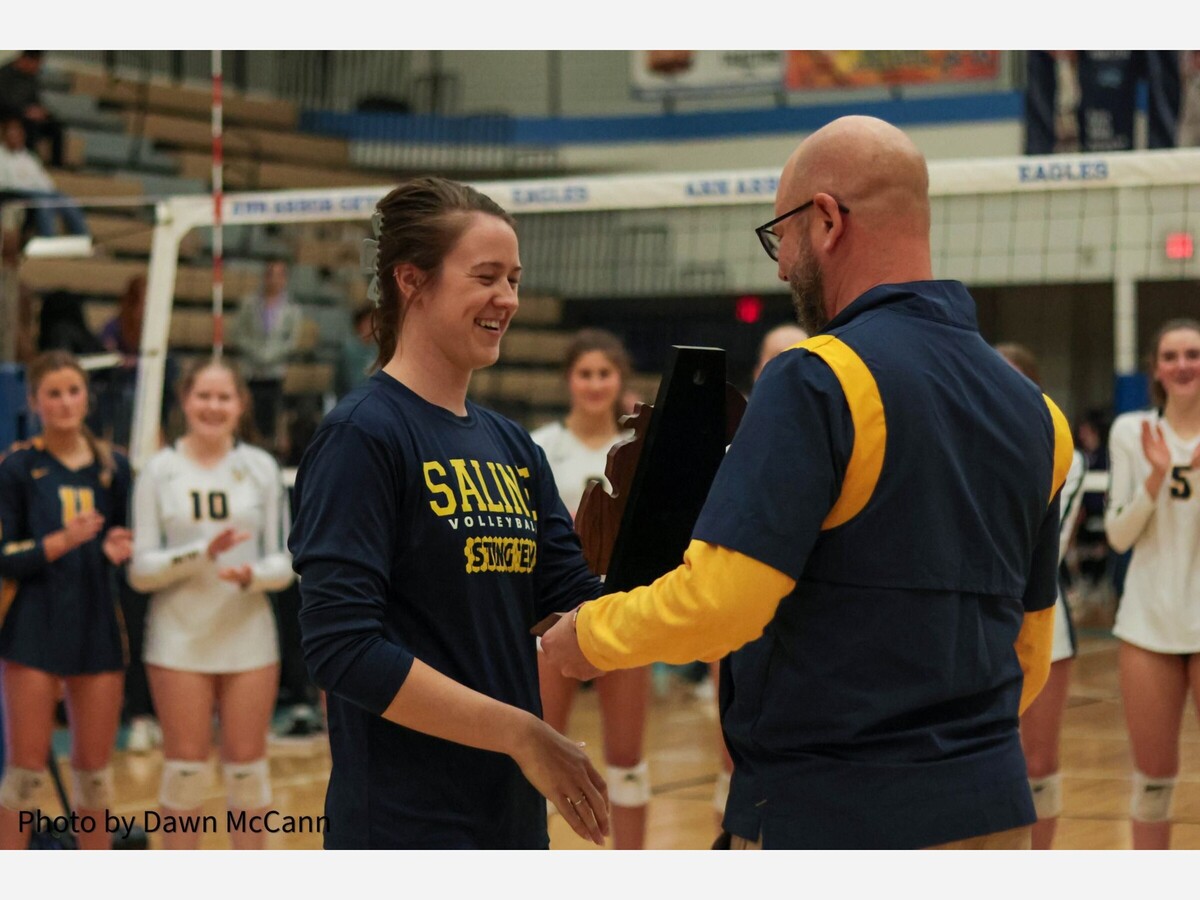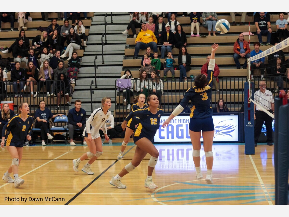 Saline took a 2-0 lead with a 25-16 win in the second set and the third set saw the teams tied at 23, but Skyline was called for an illegal formation for a 24-23 lead and Allie Smith ended the match with an ace.