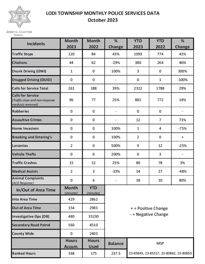 In October 2023, Deputies responded to 261 calls for police service in Lodi Twp, up from 188 the previous year for a 39% increase. Total calls for 2023 (Jan-Oct) are 2,312, up from 1,788 for the same period last year for a 29% increase.