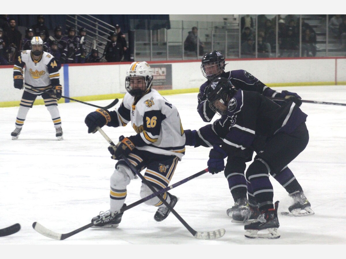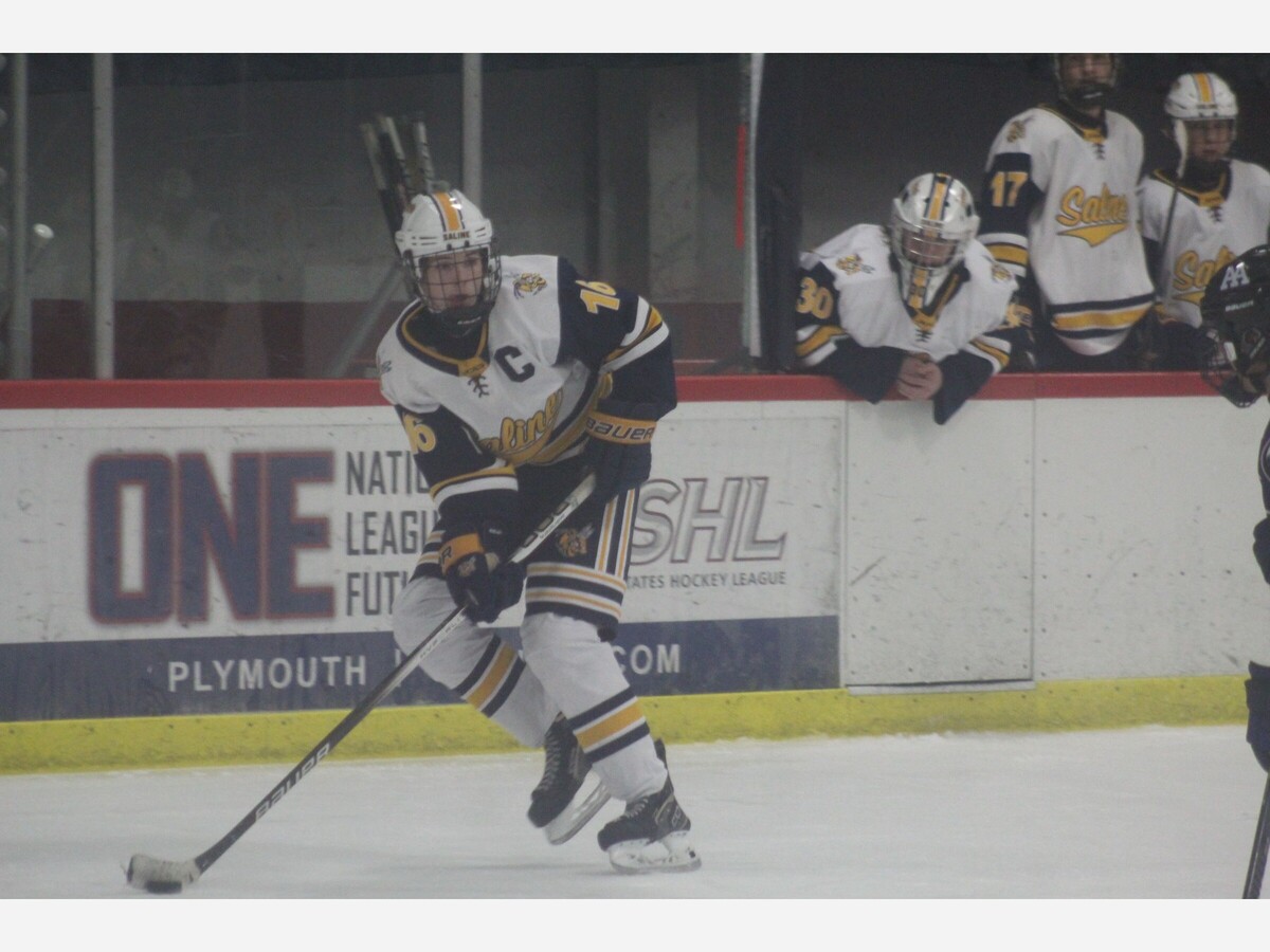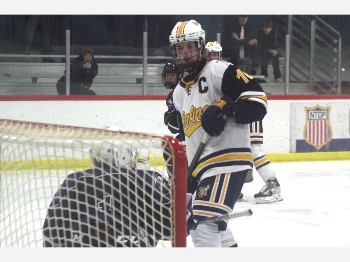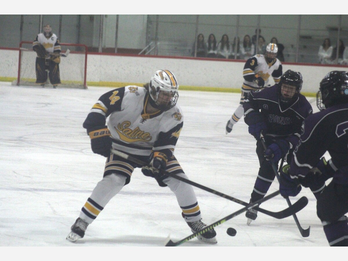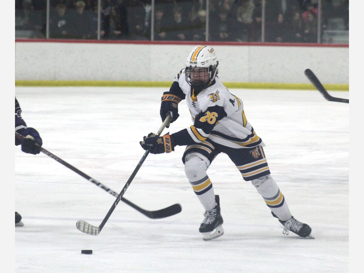 Saline answered a short time later when Jace Woodrel carried the puck into the zone and flipped a pass back to Ethan Phelps who rifled the shot home to tie the game at one after two periods.