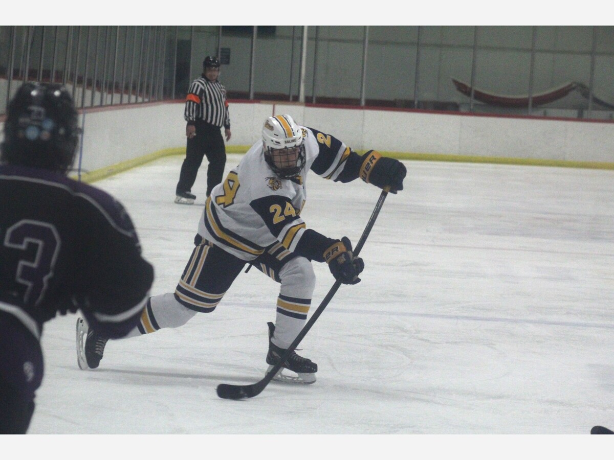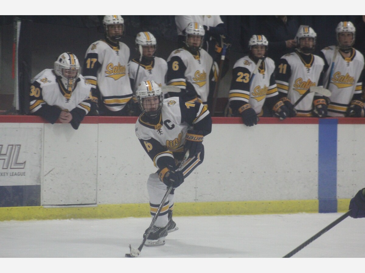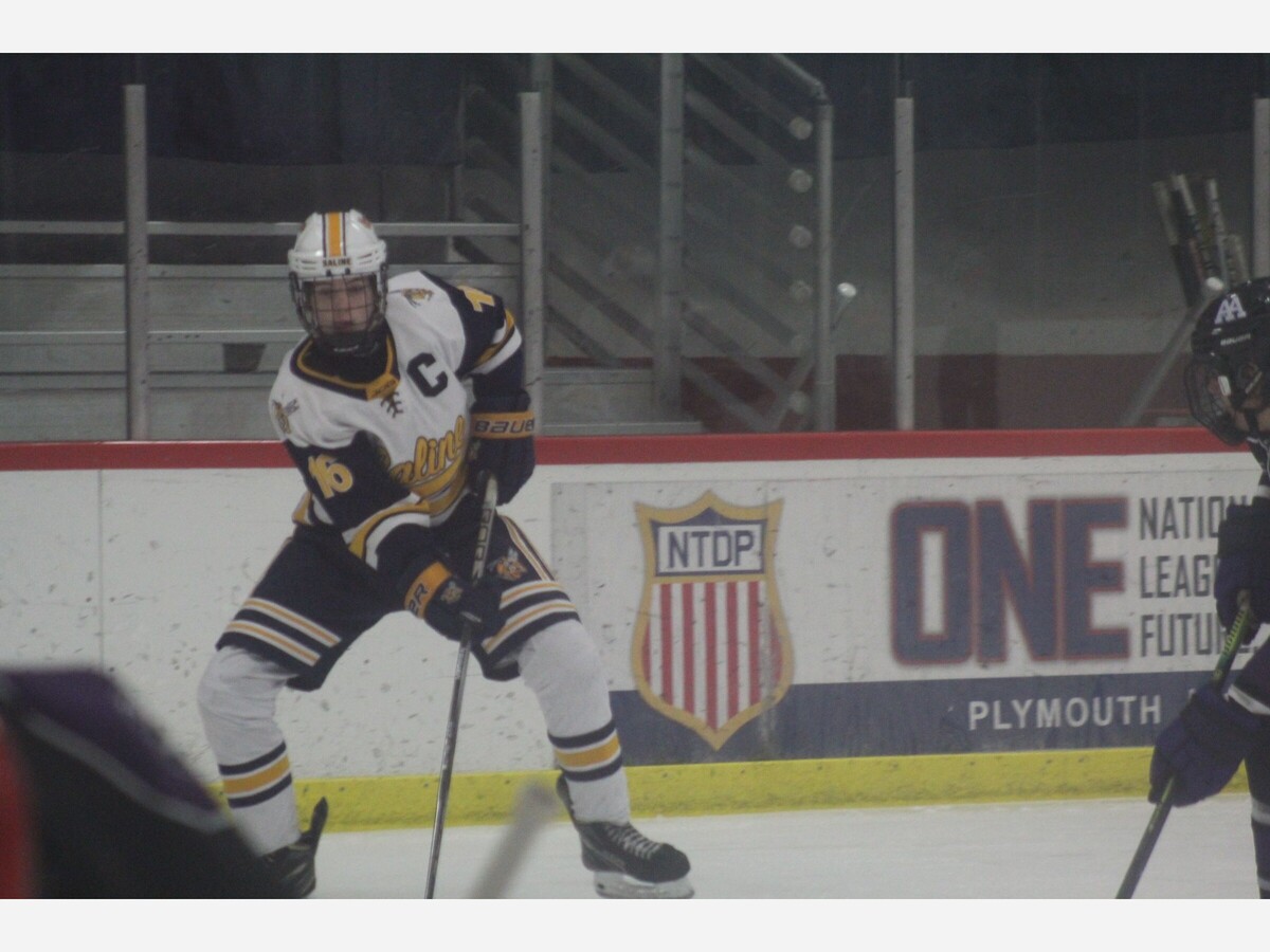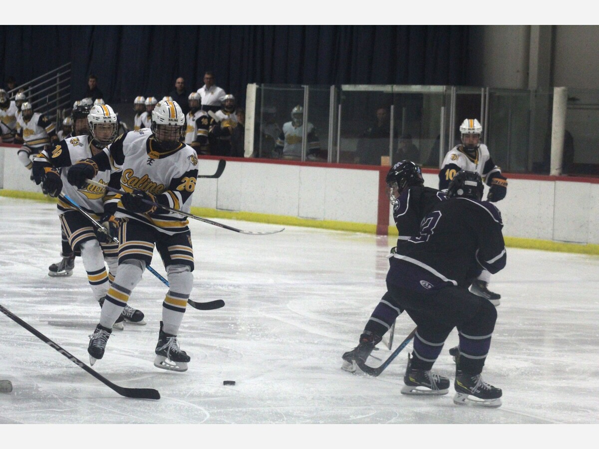 Saline answered a short time later when Jace Woodrel carried the puck into the zone and flipped a pass back to Ethan Phelps who rifled the shot home to tie the game at one after two periods.