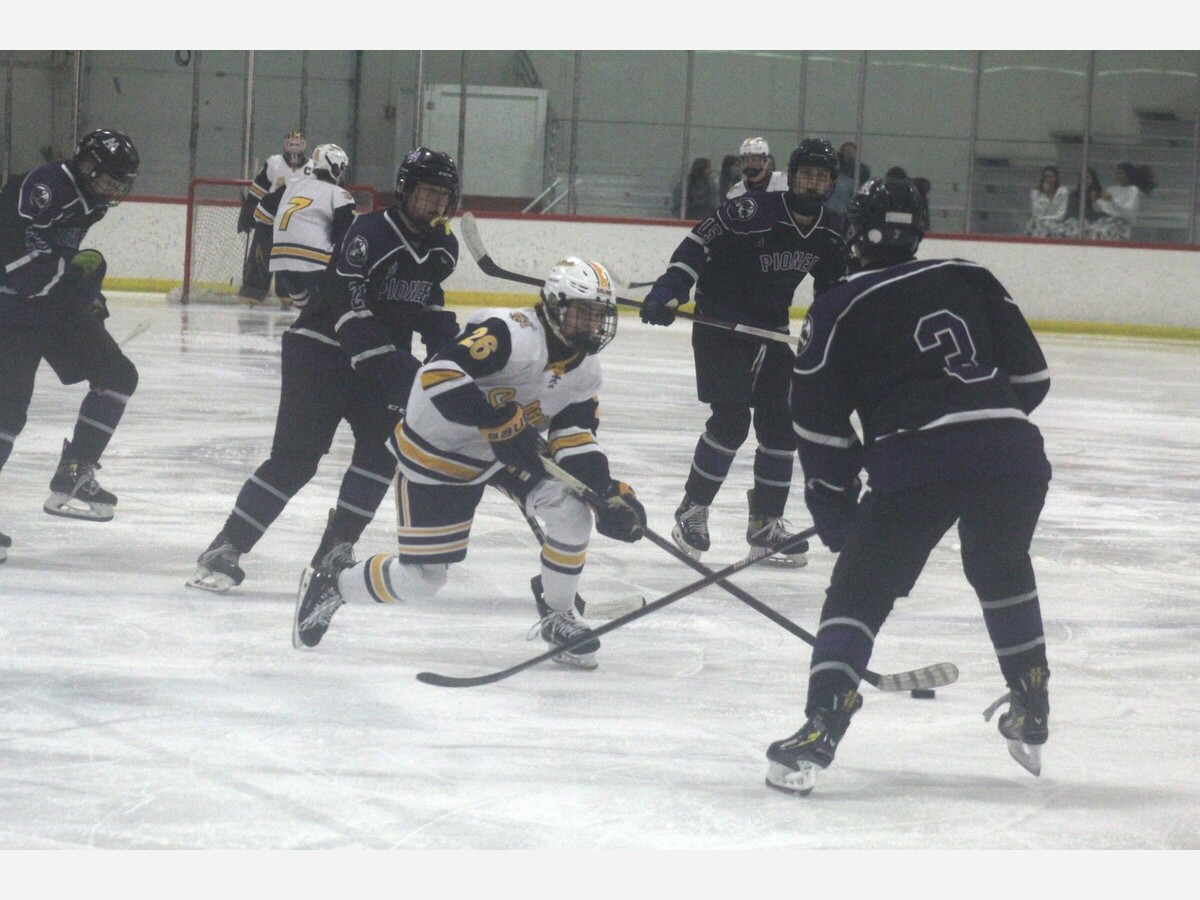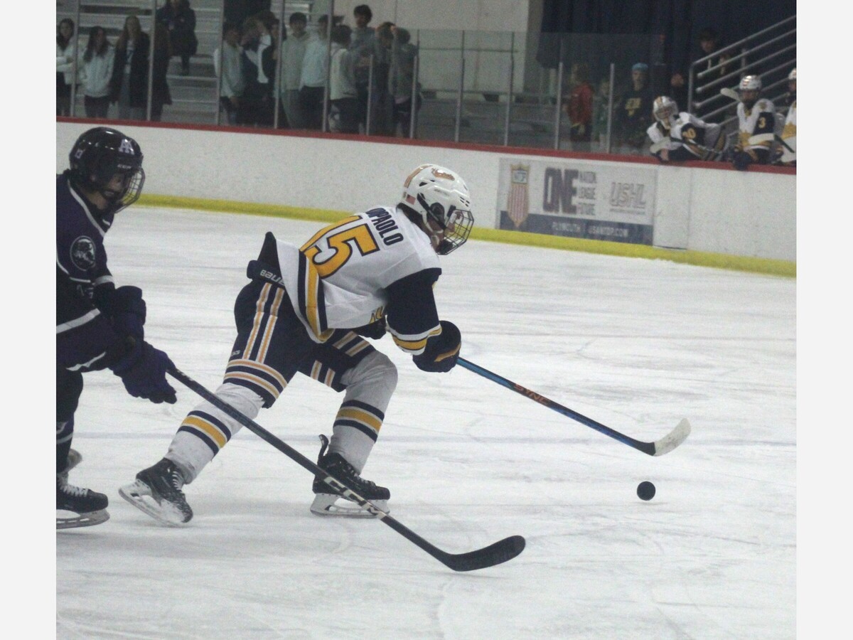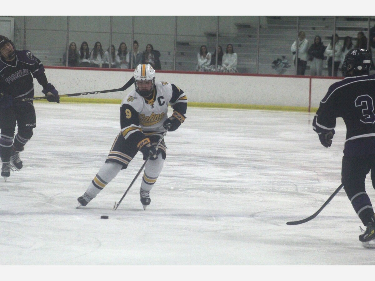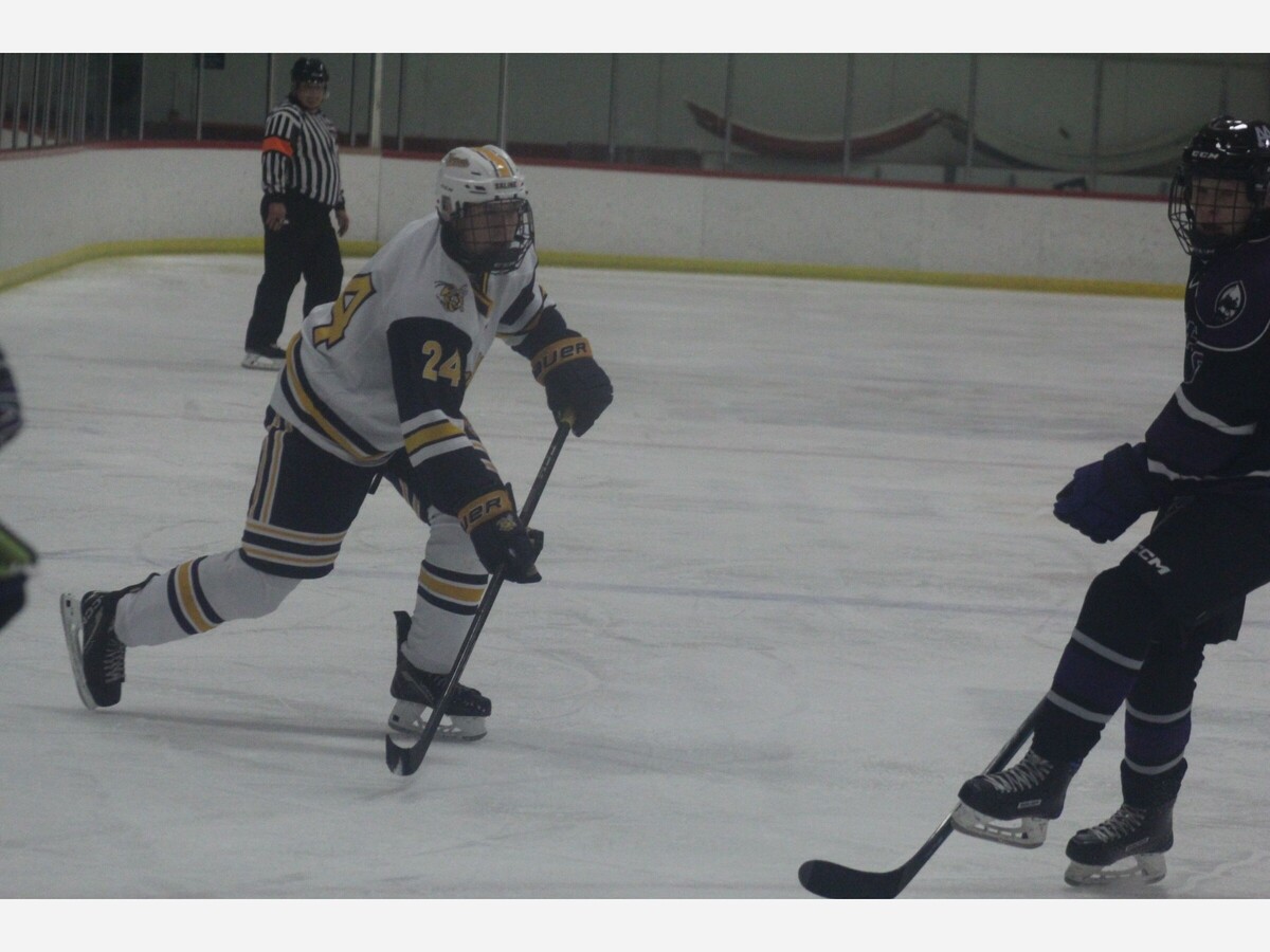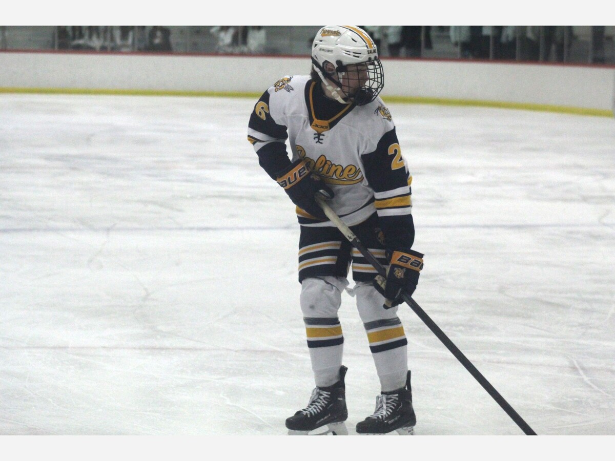 Saline answered a short time later when Jace Woodrel carried the puck into the zone and flipped a pass back to Ethan Phelps who rifled the shot home to tie the game at one after two periods.
