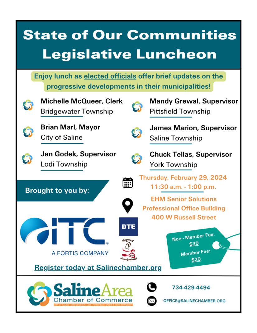 The Saline Area Chamber of Commerce is hosting its “State of Our Communities: Legislative Luncheon on Thursday, February 29, 2024, from 11:30 a.m. to 1:00 p.m.