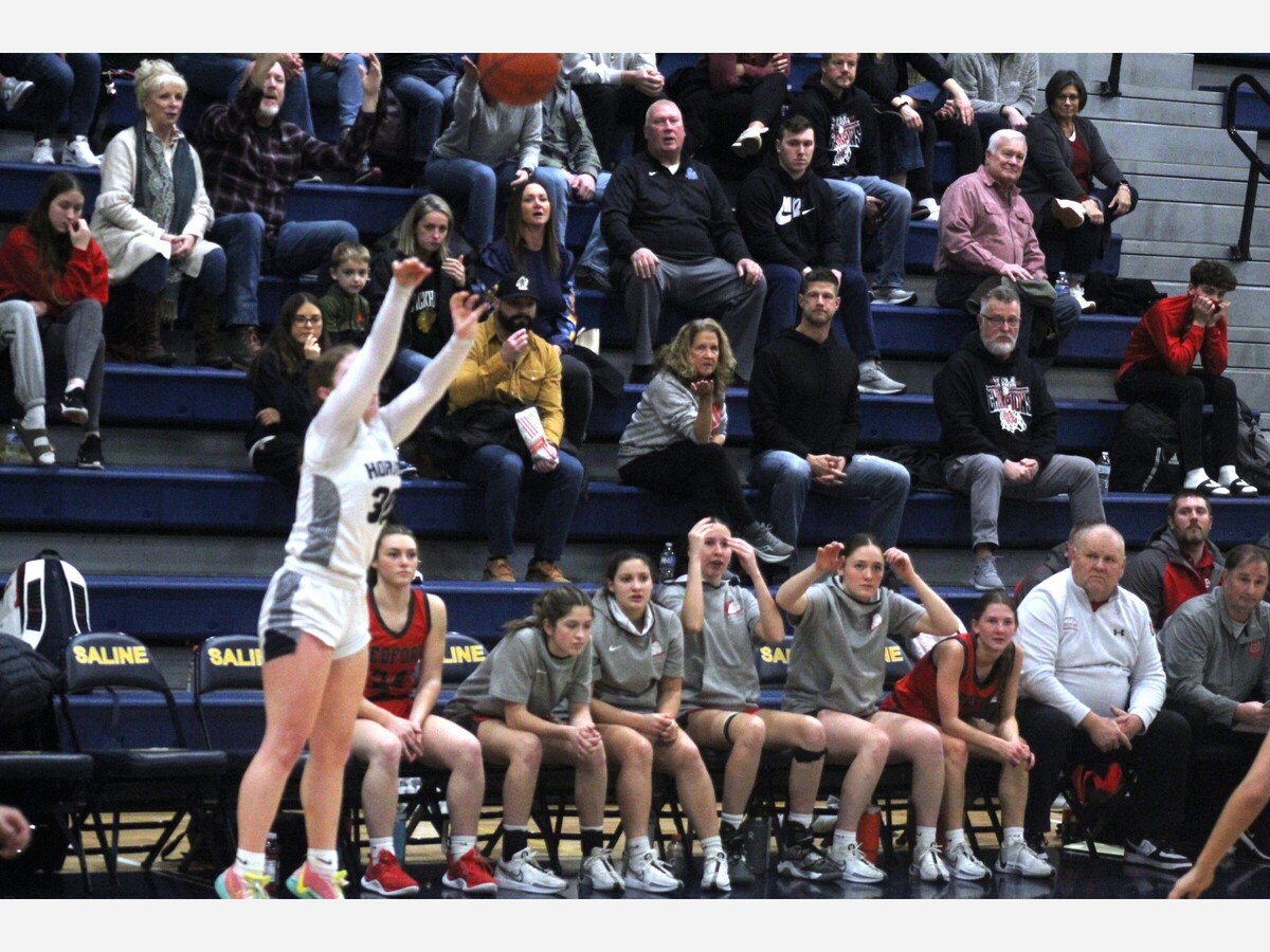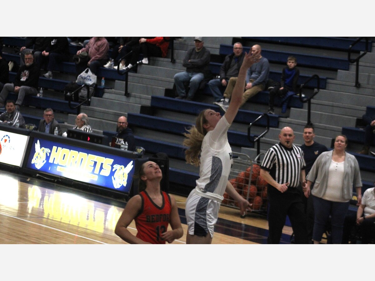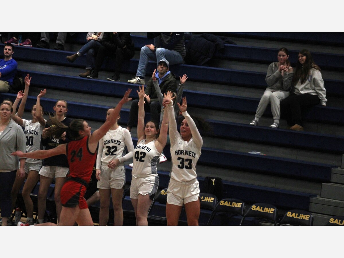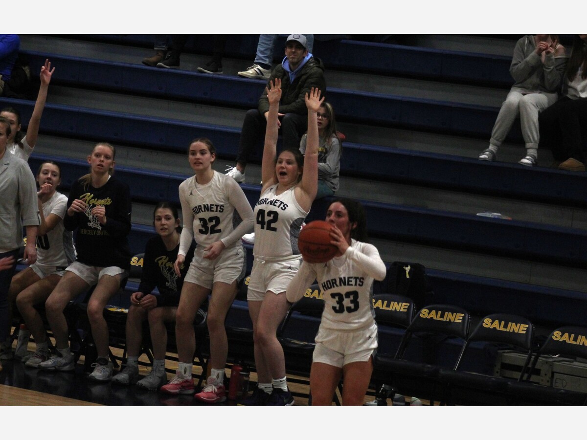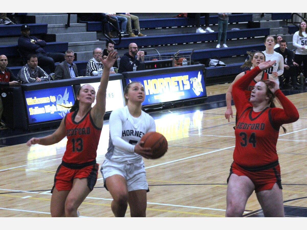 Things did not start well for the Hornets with Bedford scoring the first nine points of the game, but Saline answered with a Keira Roehm triple and baskets by Kate Stemmer and Kadyn Maida to cut the lead to 9-7. Bedford would hold an 11-10 lead after one.