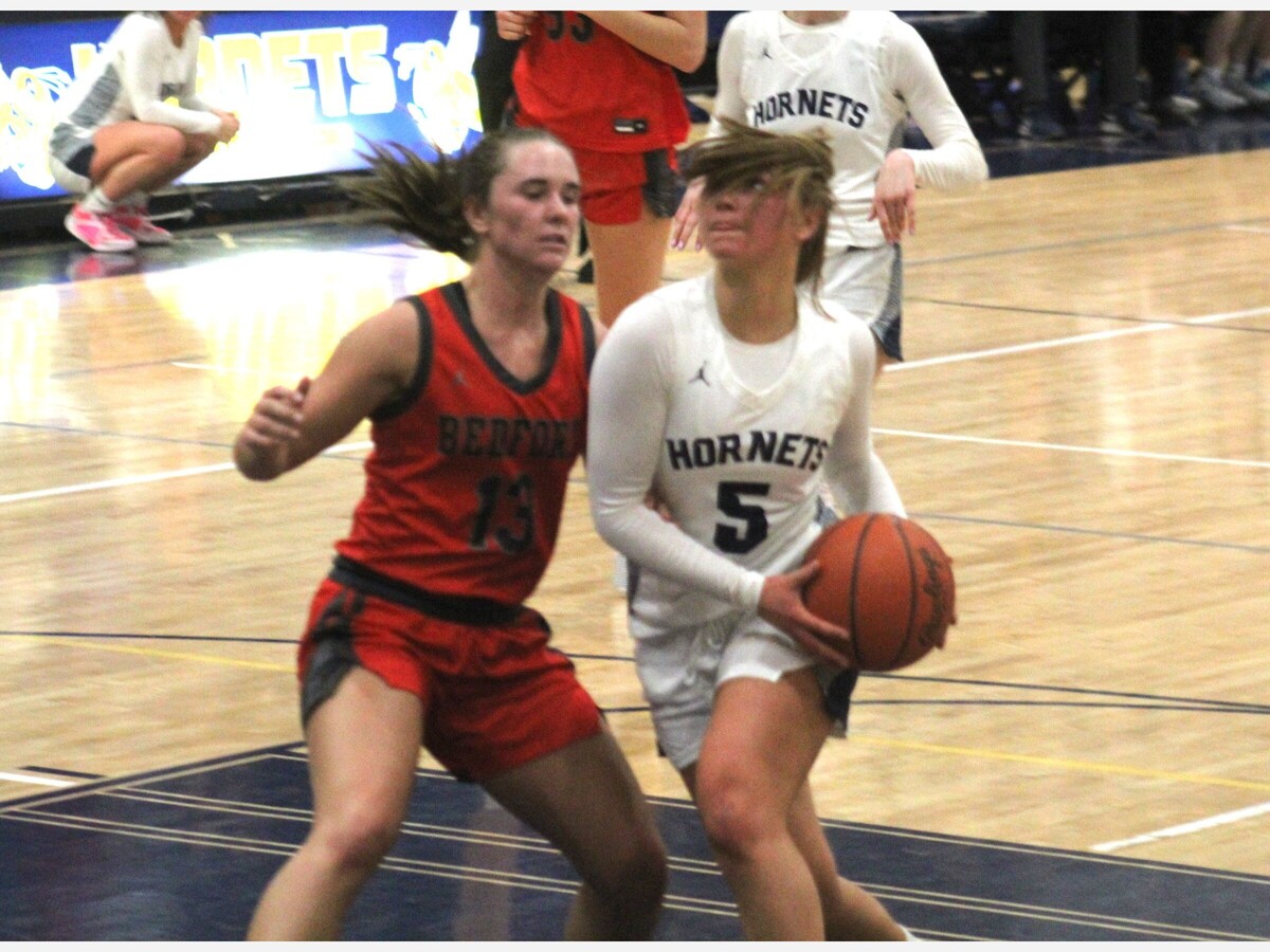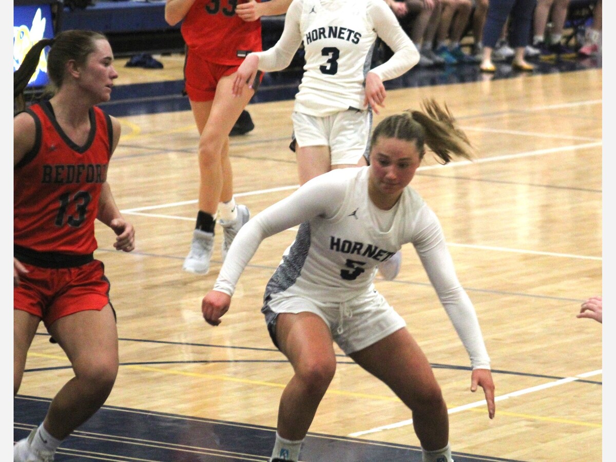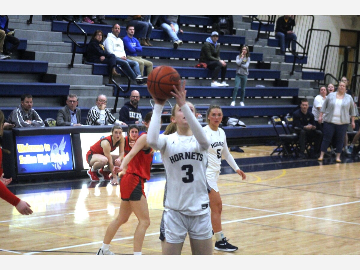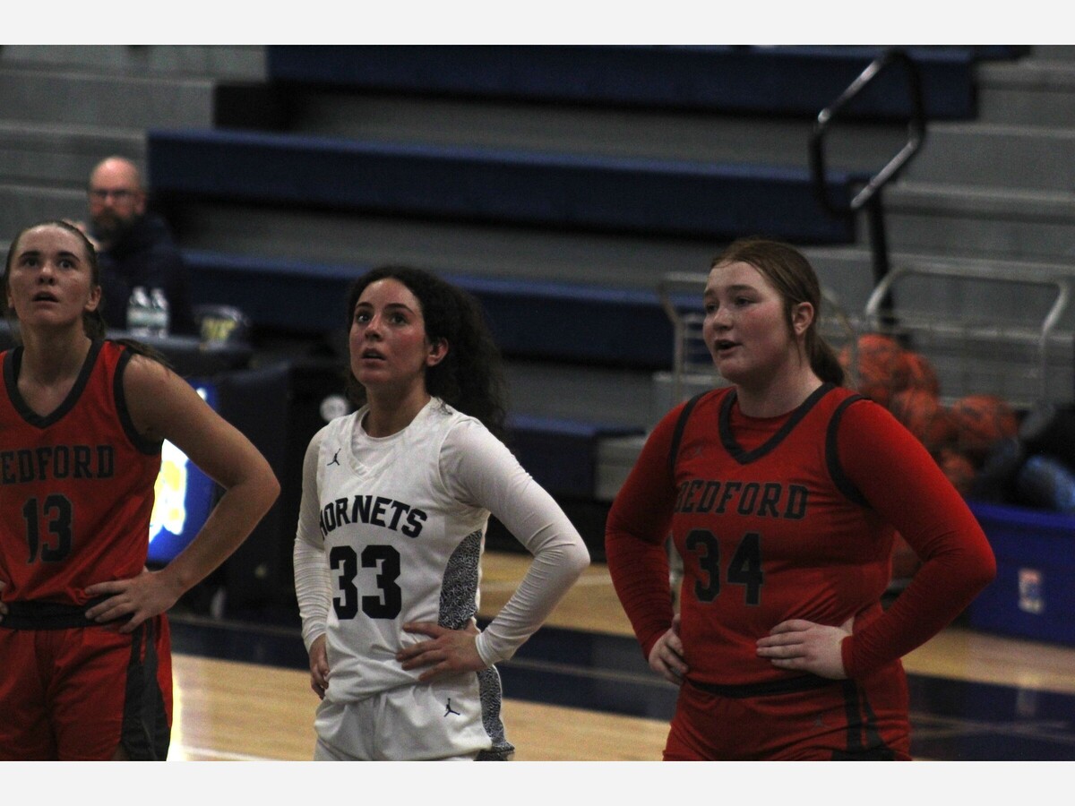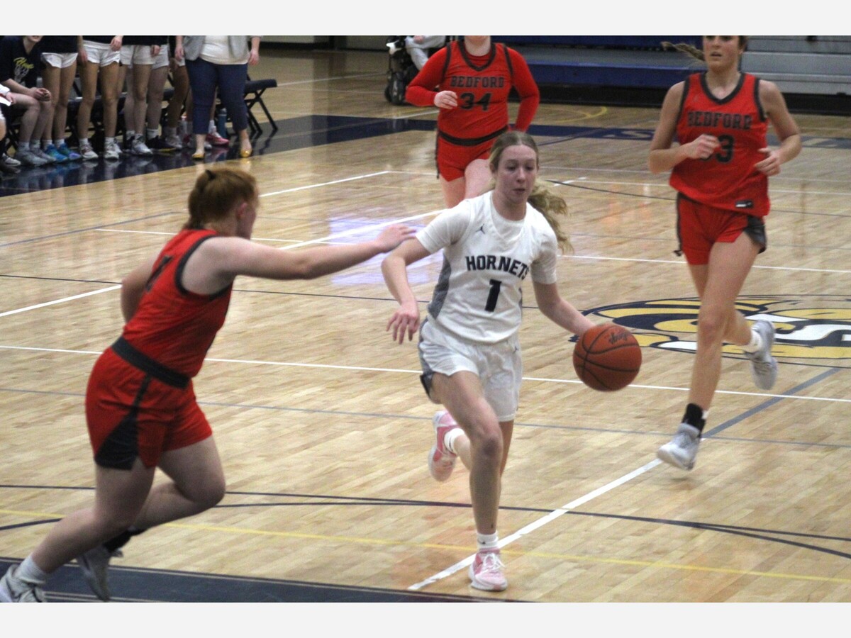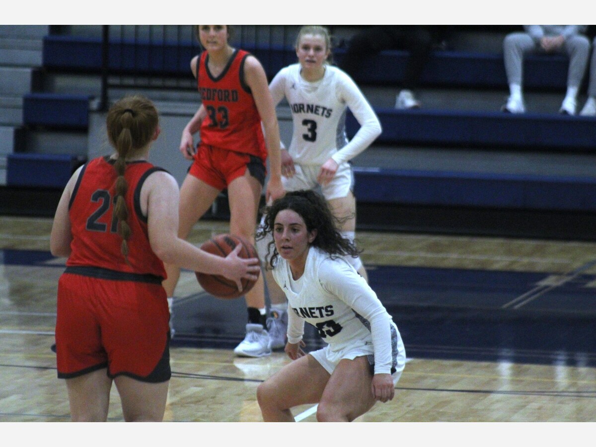 Things did not start well for the Hornets with Bedford scoring the first nine points of the game, but Saline answered with a Keira Roehm triple and baskets by Kate Stemmer and Kadyn Maida to cut the lead to 9-7. Bedford would hold an 11-10 lead after one.