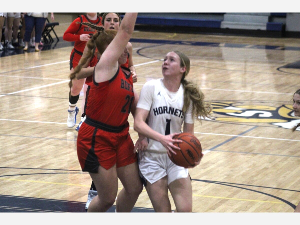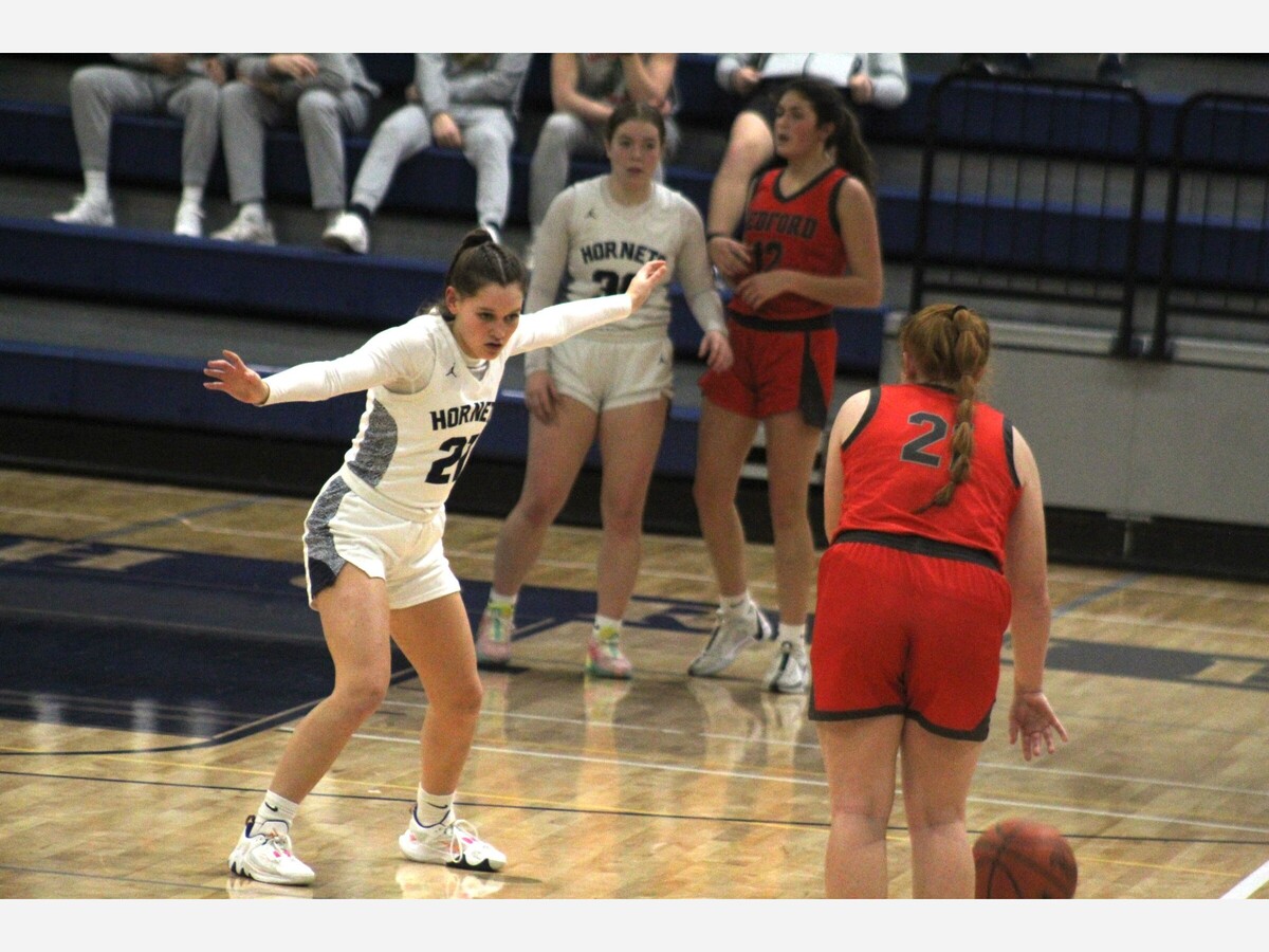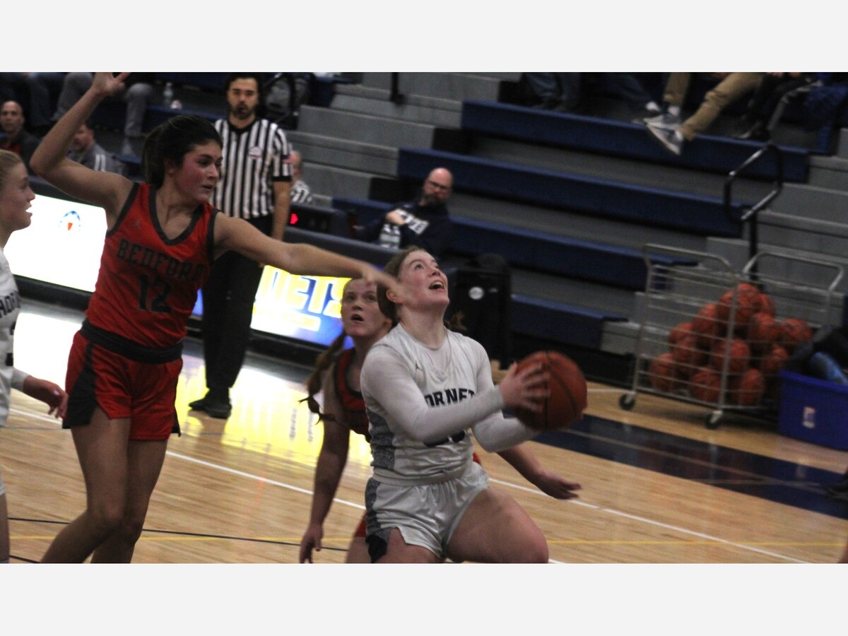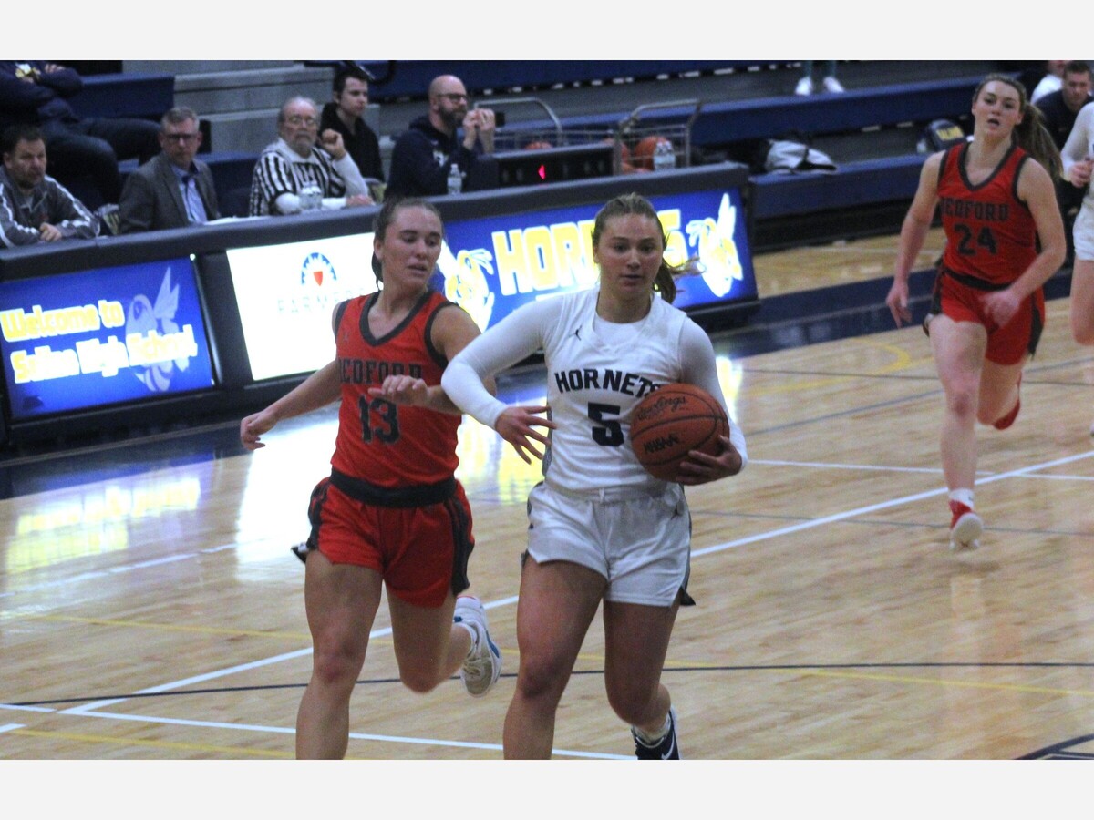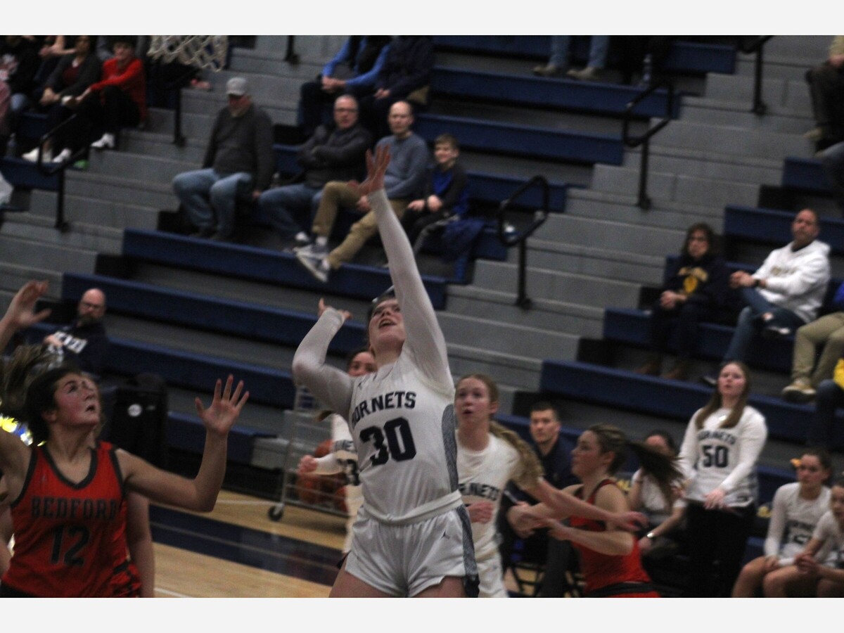 Things did not start well for the Hornets with Bedford scoring the first nine points of the game, but Saline answered with a Keira Roehm triple and baskets by Kate Stemmer and Kadyn Maida to cut the lead to 9-7. Bedford would hold an 11-10 lead after one.