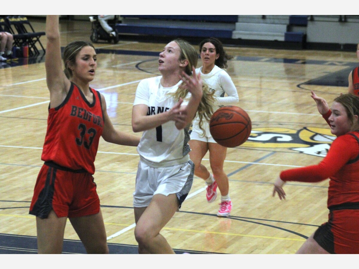 Maida got the Hornets offense going with seven points in the third quarter and a triple by Hadley Griffin left Saline tied with Bedford at 21 after three.
