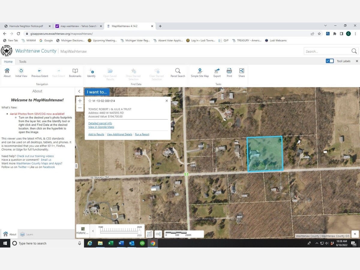 Robert & Julie Tomsic, 4460 Waters Road, Ann Arbor, MI 4810. Lodi Township parcel #M-13-02-300-014. For the purpose of installing a 40’ wide by 11’ foot deep by 2’ high solar electricity generation array installed. The applicant is requesting a variance on the side yard setback to 10’ from the required 30’ Lodi Township Zoning Ordinance Article #30.0 Dimensional Standards front yard setback in an AG zoned parcel.