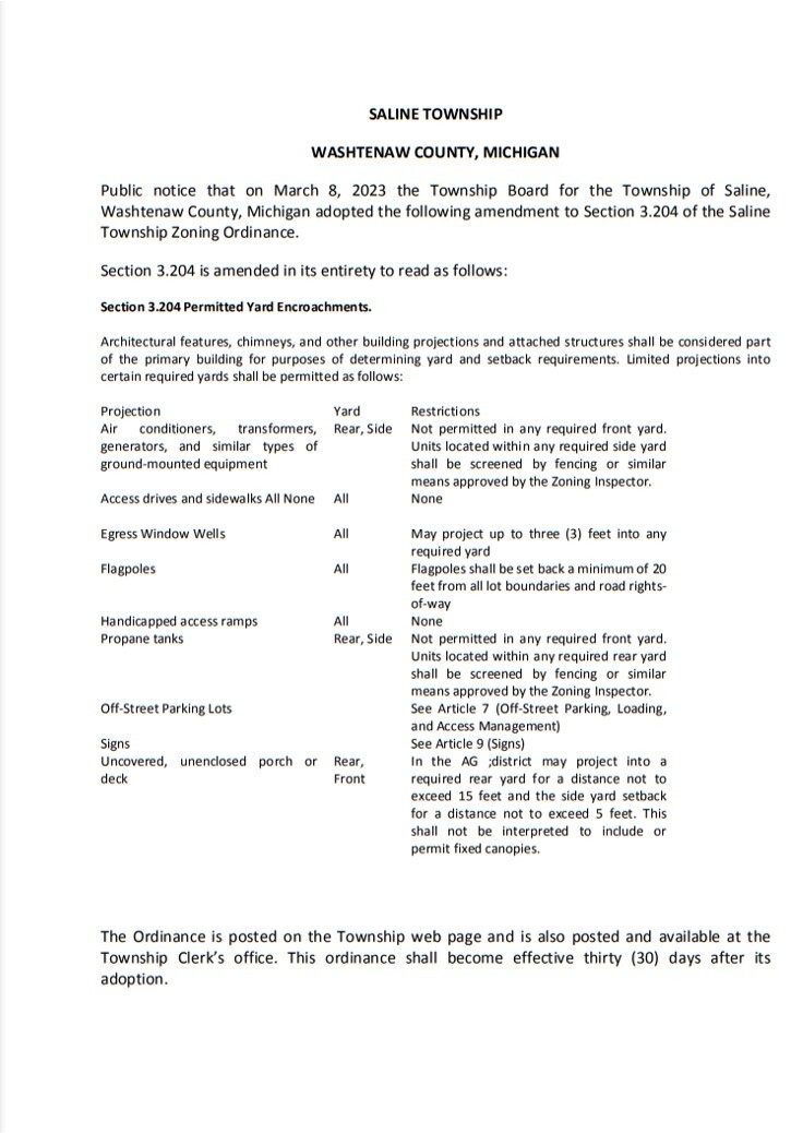 Saline Twp: Adoption of Zoning Ordinance Amendment